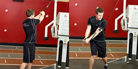 - встаньте боком к тренажеру и возьмитесь за рукоять одной рукой, сделайте шаг в сторону;