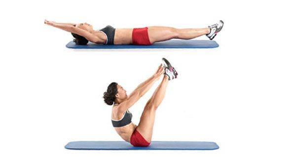 - На выдохе одновременно поднимайте ноги вверх и скручивайте корпус, стараясь дотянуться ладонями до ступней.
