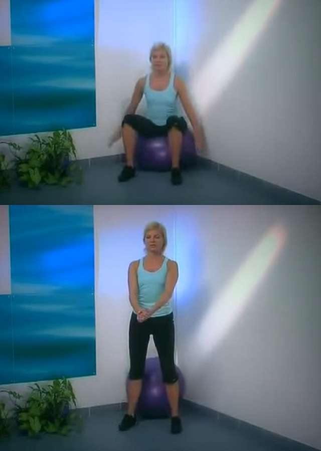 Исходное положение сидя на мяче. На выдохе спрыгиваем с мяча.