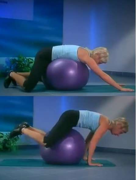 Исходное положение лежа на мяче. На выдохе смещаемся вперед, при этом сжимаем мышцы тазового дна. Возвращаемся в исходное положение.