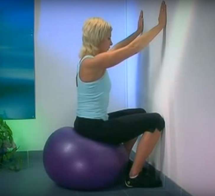Исходное положение сидя на мяче, ладонями и коленками упираемся в стену. Спина прямая. На вдохе расслабление, на выдохе – сокращение мышц тазового дна.