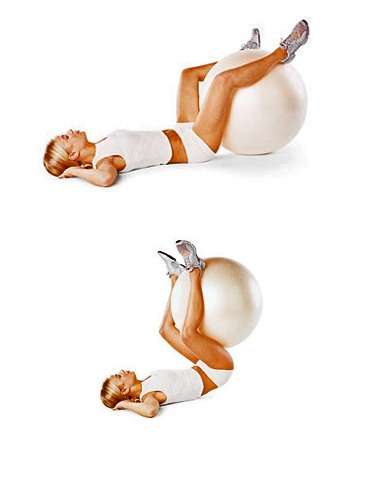 Исходное положение лежа на спине. Охватываем мяч ногами, на выдохе поднимаем мяч. Возвращаемся в исходное положение.