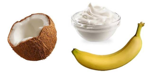 Тщательно раздавите половину банана. Добавьте к нему 30 миллилитров масла кокоса и 15 миллилитров жирной сметаны. Разогрейте смесь. Нанесите на волосы на полчаса.