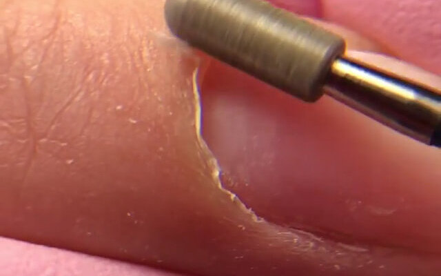 Сначала отодвиньте кутикулу с помощью апельсинового очистителя или карандаша. Это делается максимально аккуратно, так как у многих людей тонкие и ломкие кутикулы. Следующий шаг — использование кусачек для кутикулы. Сначала производится окончательное поднятие кутикулы с помощью «игольчатой» фрезы. На этом этапе можно также удалить лоскут той же иглой и устранить боковые гребни.