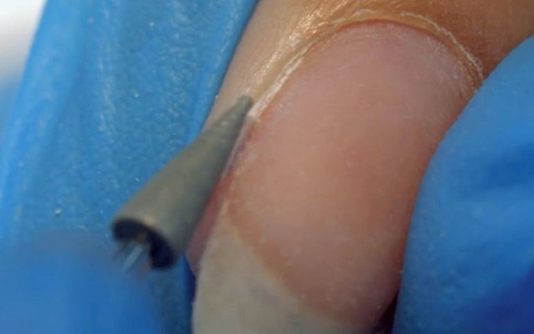 Если скол все еще присутствует, его можно удалить узкой прямоугольной фрезой. Держите его как можно параллельнее ногтю, чтобы избежать отслойки и травмирования матки.