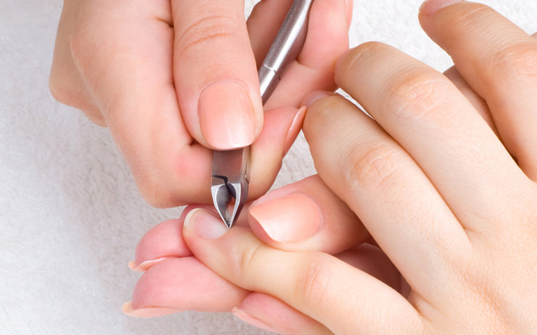 Срезание отмершей кутикулы производят любым удобным острым инструментом. Лезвия должны находиться строго параллельно пластине. Смыкая, их сразу поднимают, удаляя тем самым срезанную кожу. Все отмершие участки убирают полностью.