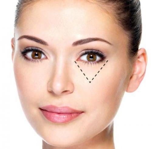 Треугольник определяется широким лбом и заостренным подбородком. Чтобы придать лицу овальную форму, следует затемнить виски и выступающую часть подбородка. Область боковых скул осветляют. В этом случае используются румяна двух цветов. При этом темные цвета оттеняют верхние скулы, а более светлые наносятся на ложбинку в области скул. Акцент делается на глаза.