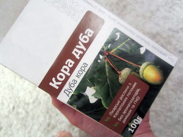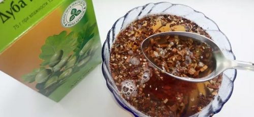 500 коры дуба залить 3 литрами воды, варить около 30 минут. Лучше использовать минеральную воду без газа.