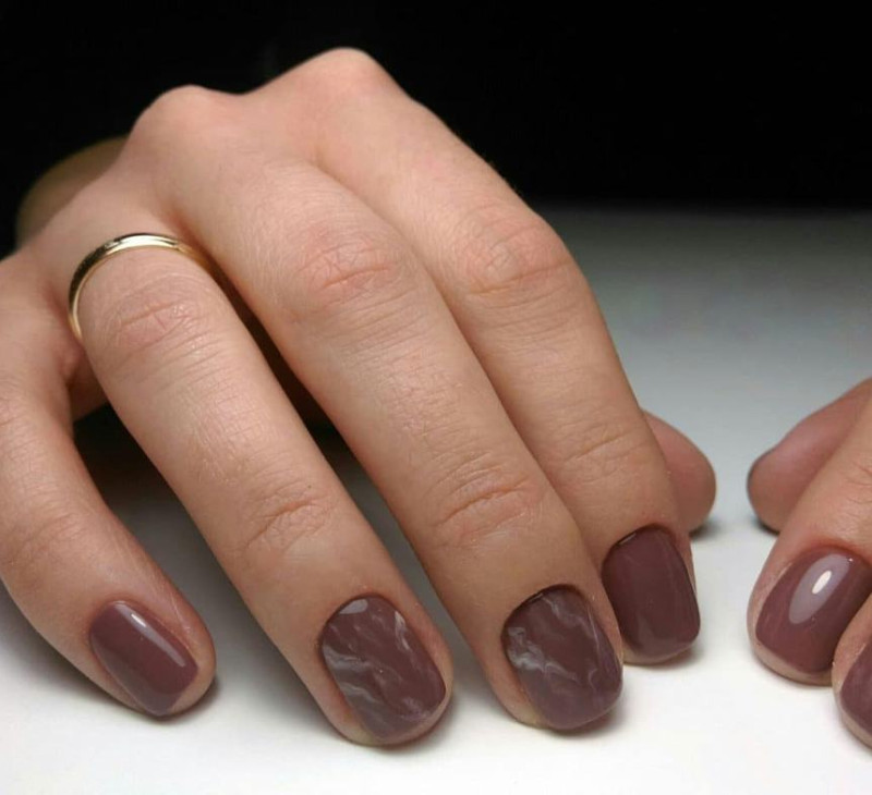 Такой подход к выполнению маникюра придает ему реалистичный и законченный вид. Шоколадный мрамор на ногтевых пластинах рекомендуется располагать выборочно, не декорировать так каждый палец.