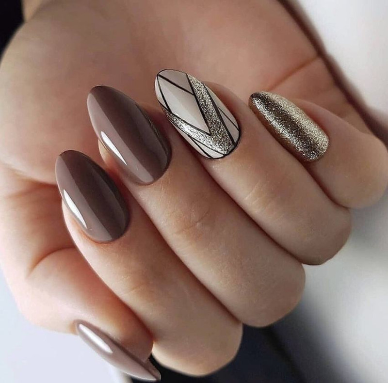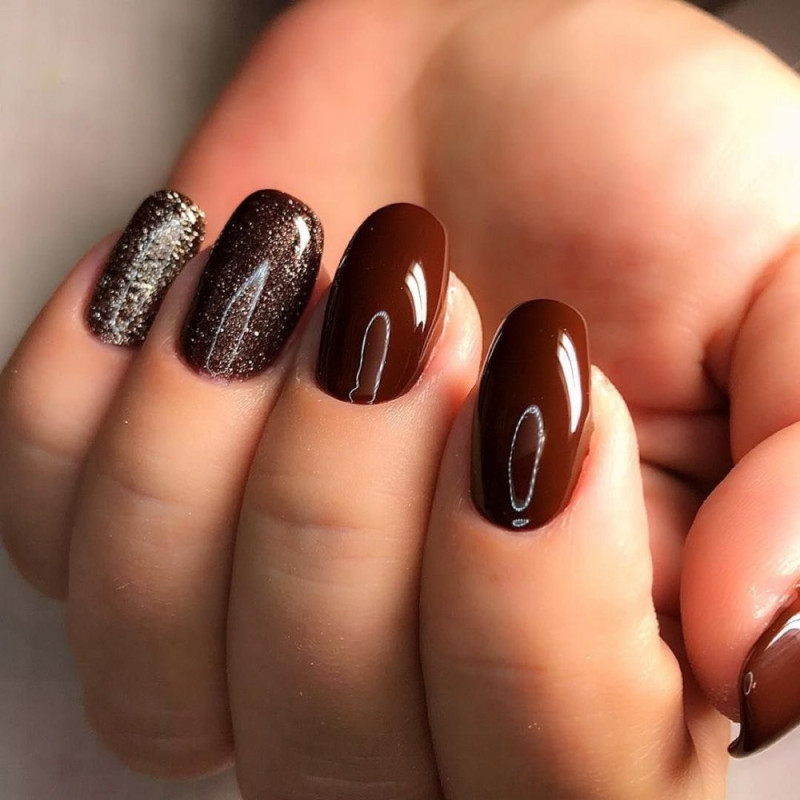 Стразы, блестка или фольга — отличное дополнение для любых оттенков коричневого. Такой маникюр удивит как ваших старых друзей, так и новых знакомых — пользуйтесь этим преимуществом.