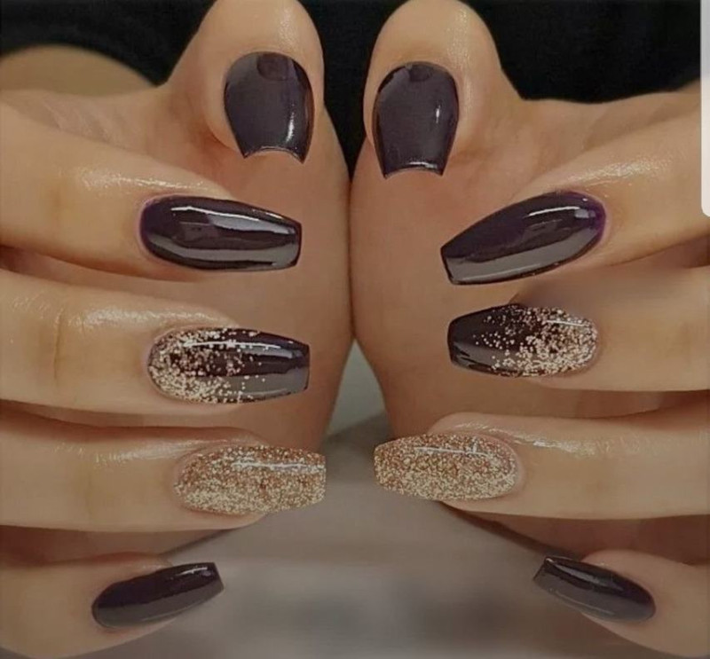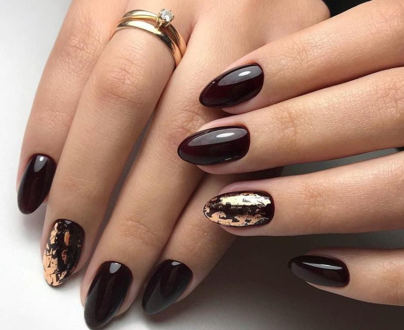 Наиболее дорогая и праздничная композиция сочетания коричневого цвета – это сочетание коричневого с золотом. Для декора вечернего маникюра мастера нейл-арта используют золотую фольгу, глиттер, конфетти, полноценное покрытие, создающее вид металлического глянца.