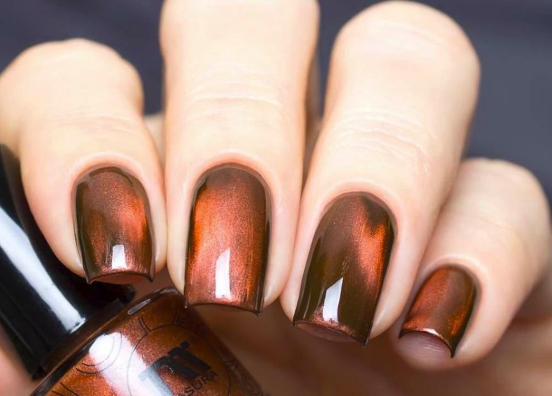 Если вы предпочитаете медный оттенок, обязательно используйте глянцевый лак. Цвет может быть однотонным или дополненным мелкими блестками или пудрой.