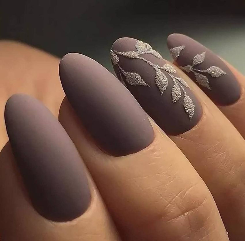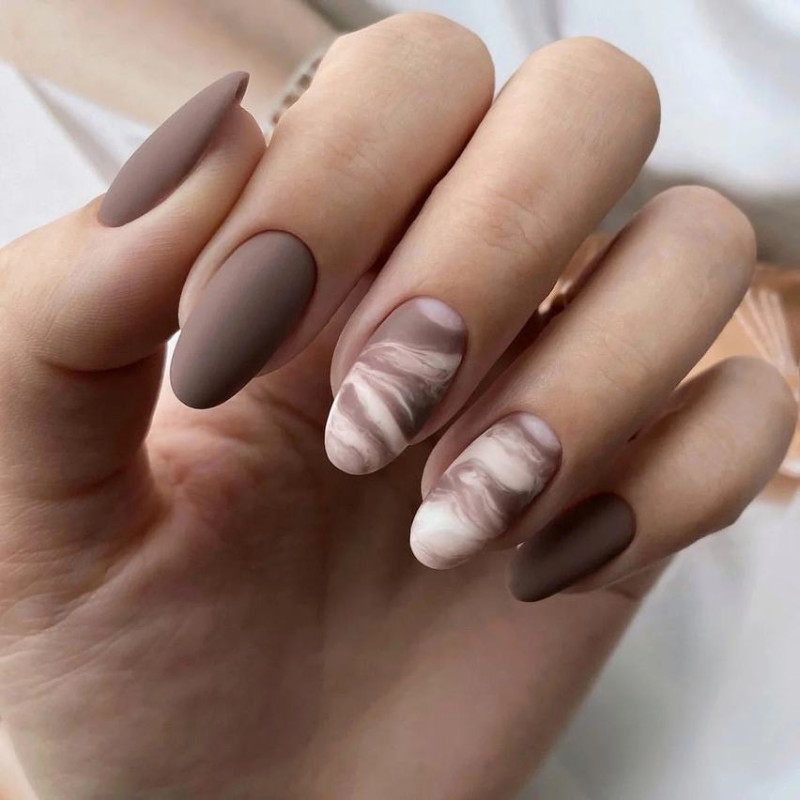 Матовый маникюр коричневого цвета встречается не слишком часто. А для его создания рекомендуется использовать темные оттенки — кофейный, шоколадные и так далее.