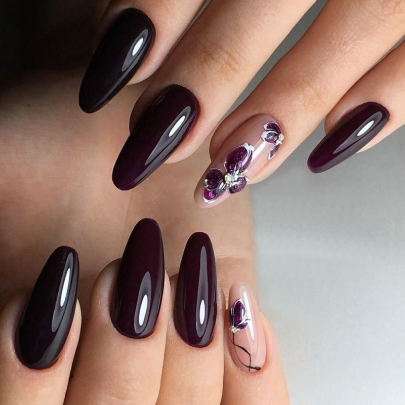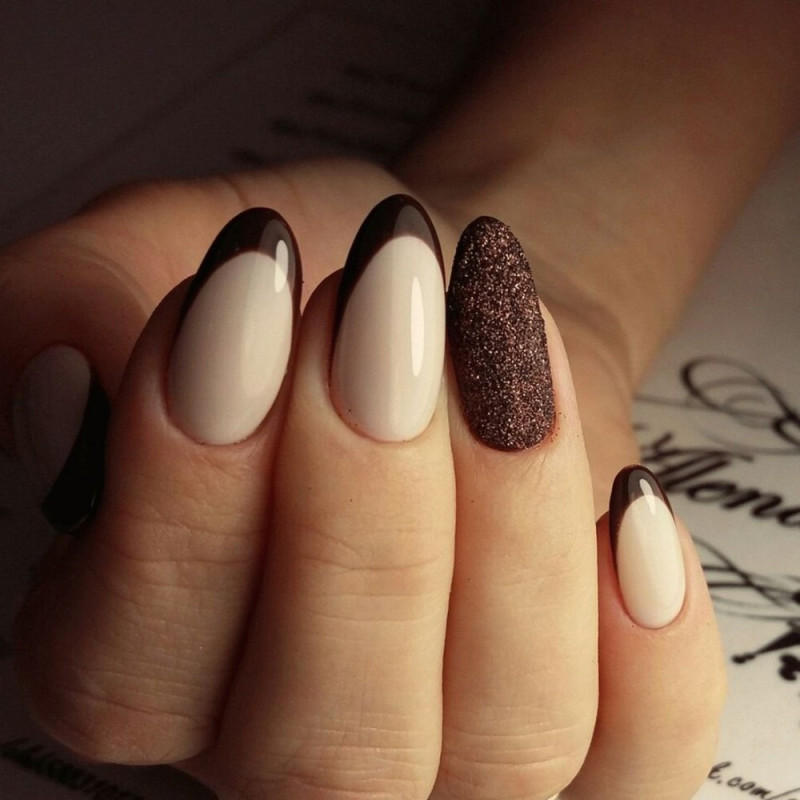 Ноготки-миндаль как на фото недаром считаются универсальными при выполнении покрытия. Для них подходят все оттенки – шоколадный маникюр, почти черные тона, карамельные и нежные пастельные оттенки коричневого.