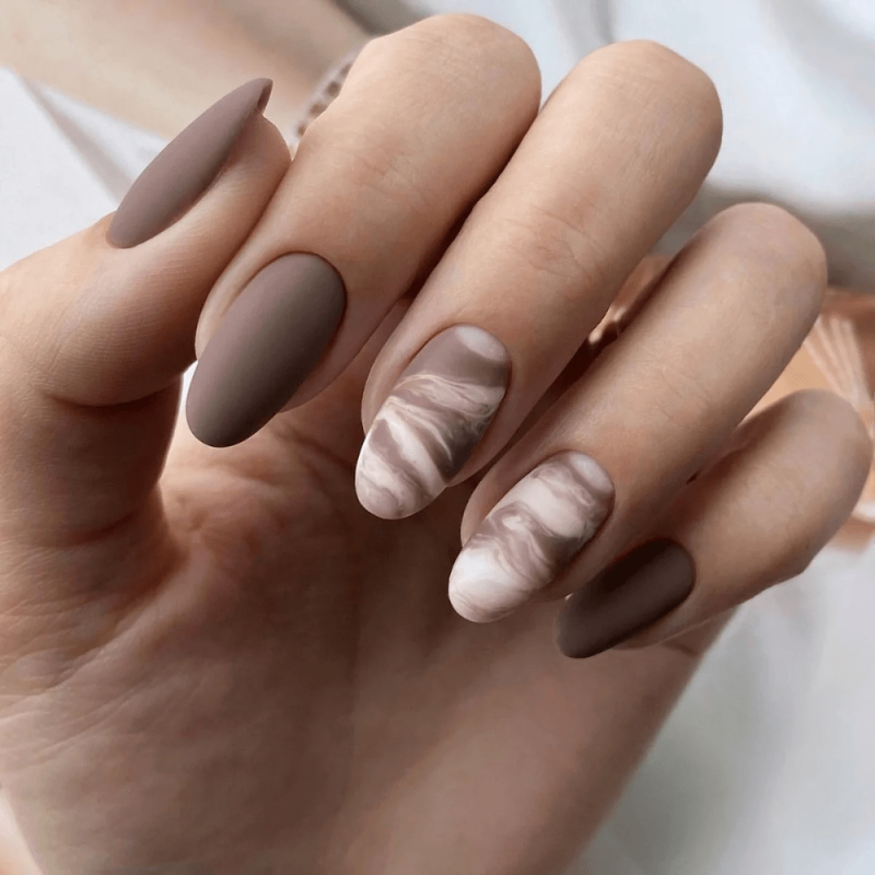Эта техника исполнения маникюра в шоколадных тонах смотрится особенно эффектно. Для создания характерных мраморных разводов задействуют черный и белый цвета.