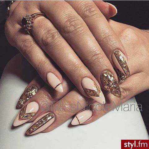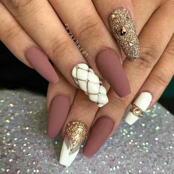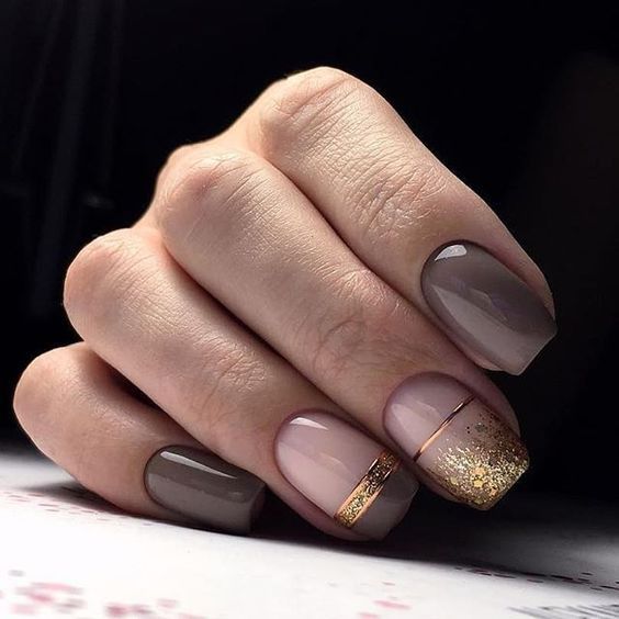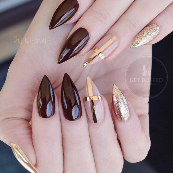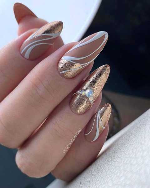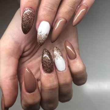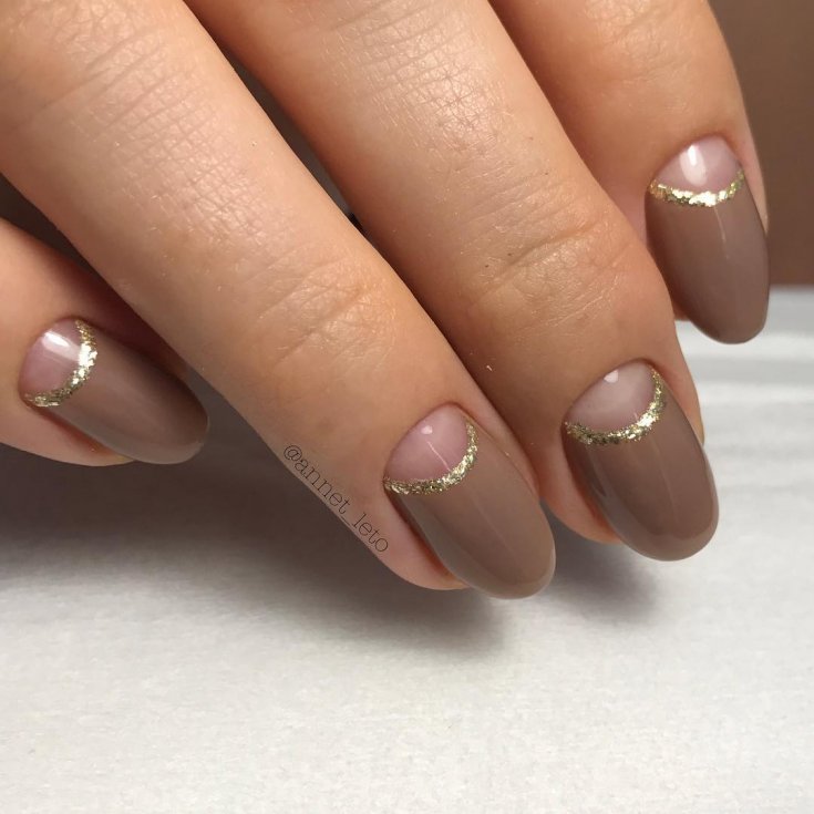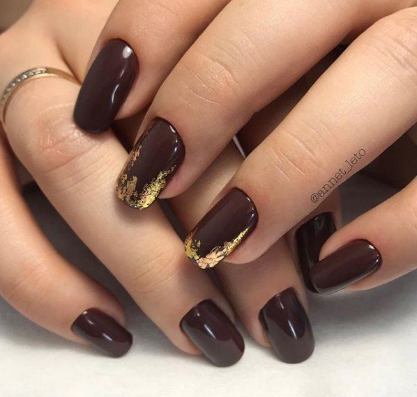 Для вечернего, праздничного и маникюра по случаю подойдет сочетание коричневого с золотом. Фольгой, блестками, пудрой, пигметами или хлопьями Юки можно декорировать ногти как с темно-коричневым, так и светло-коричневым гель-лаком. Все оттенки будут хороши в золотом обрамлении. Дизайн можно дополнить стразами, частичным покрытием матовым топом или объемными элементами из пластичного геля. Самый простой и быстрый дизайн с золотом можно создать даже в домашних условиях с помощью золотых хлопьев. Для этого нужно сделать маникюр в коричневых тонах гель-лаком, нанести с помощью аппликатора хлопья Юки в хаотичном порядке и зафиксировать их матовым или глянцевым топом. Также можно поэкспериментировать с витражным гель-лаком.