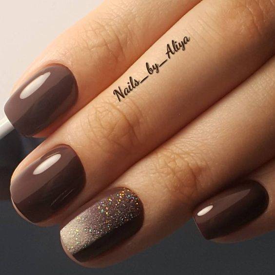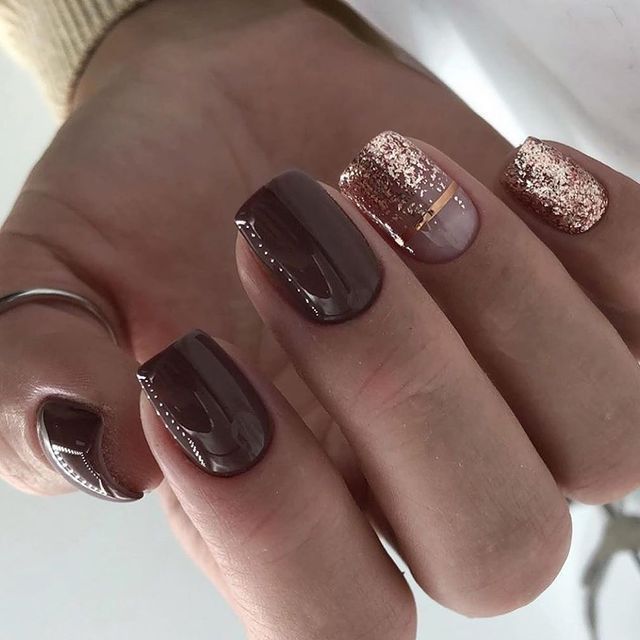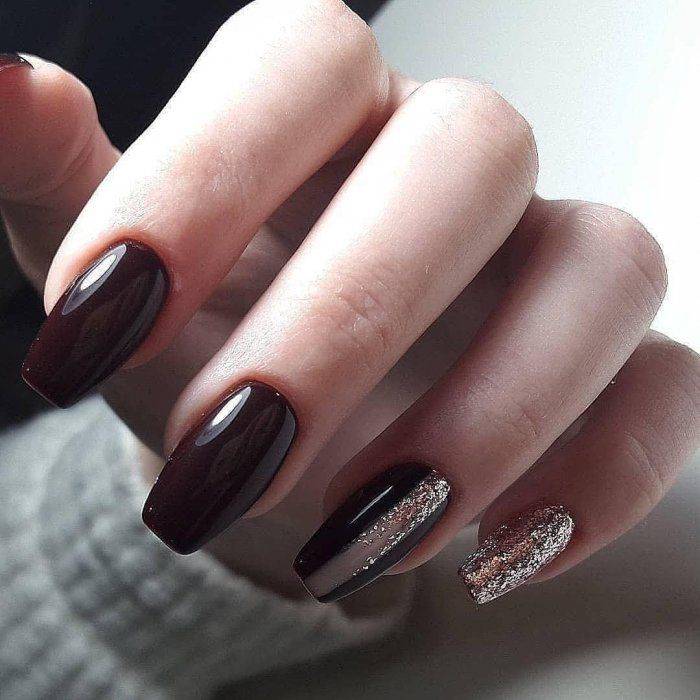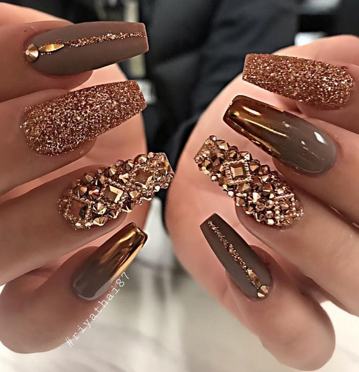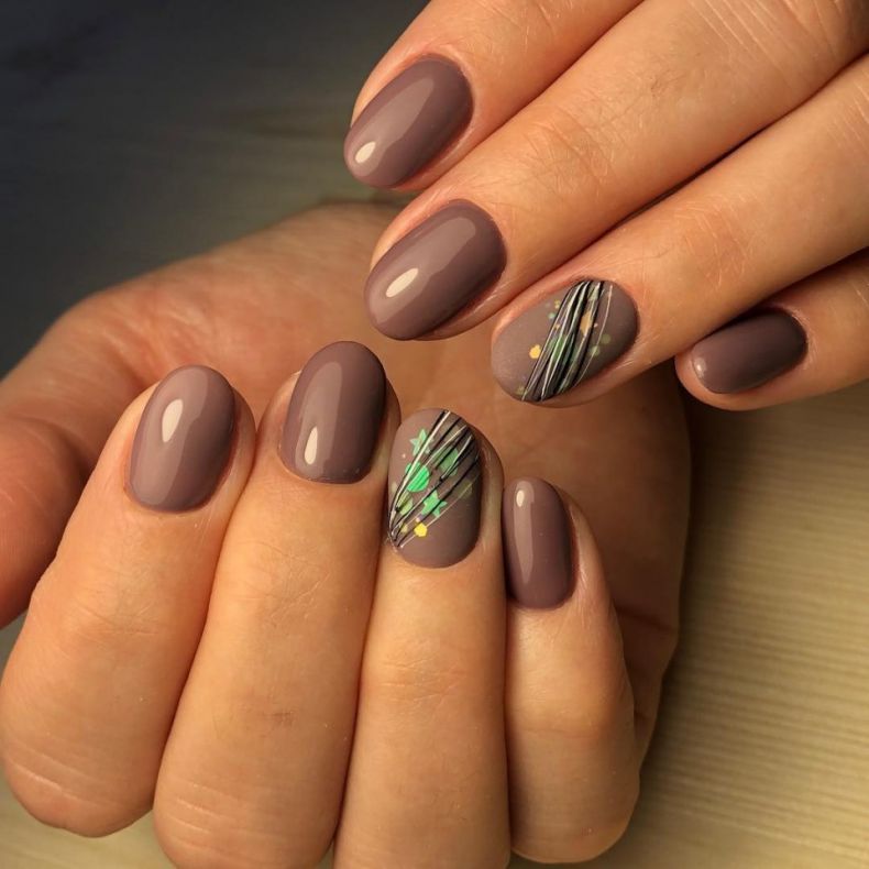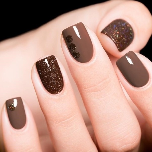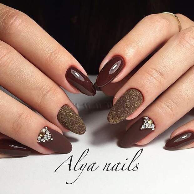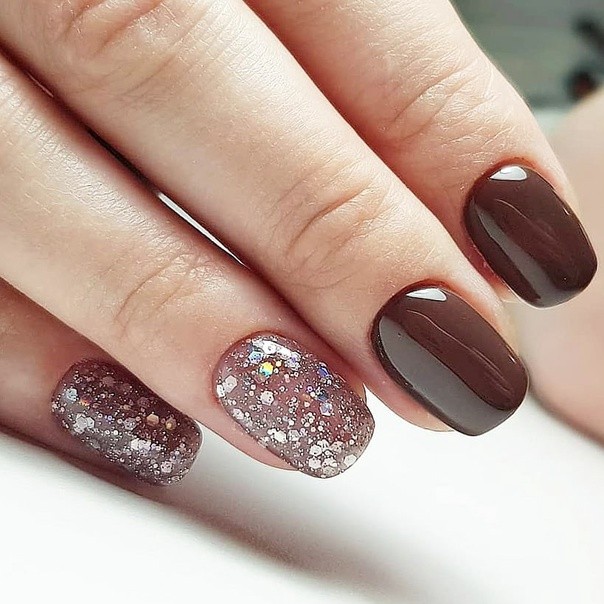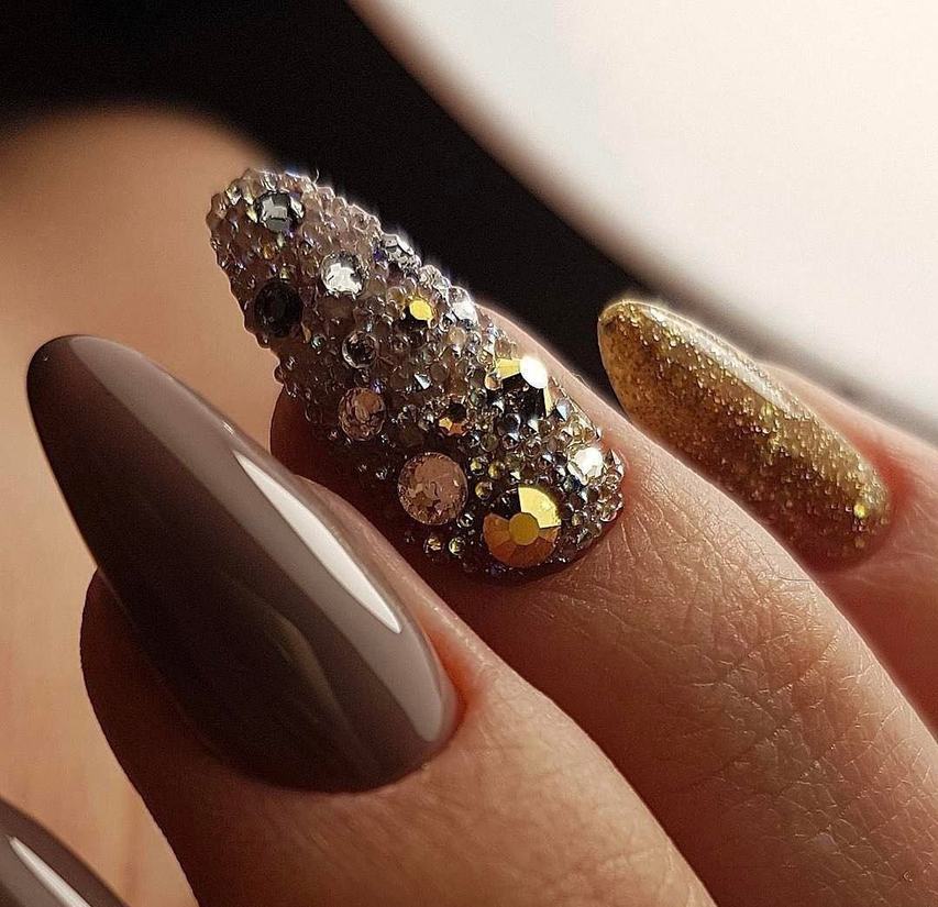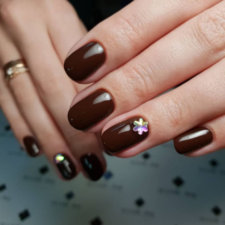 Стразы, блестка или фольга — отличное дополнение для любых оттенков коричневого. Такой маникюр удивит как ваших старых друзей, так и новых знакомых — пользуйтесь этим преимуществом.