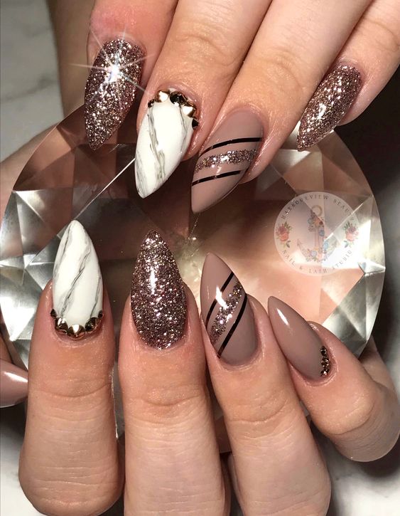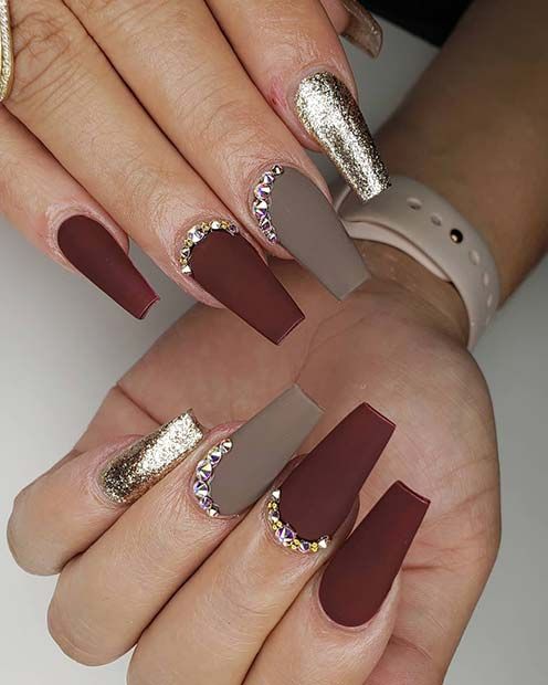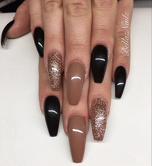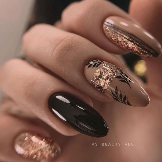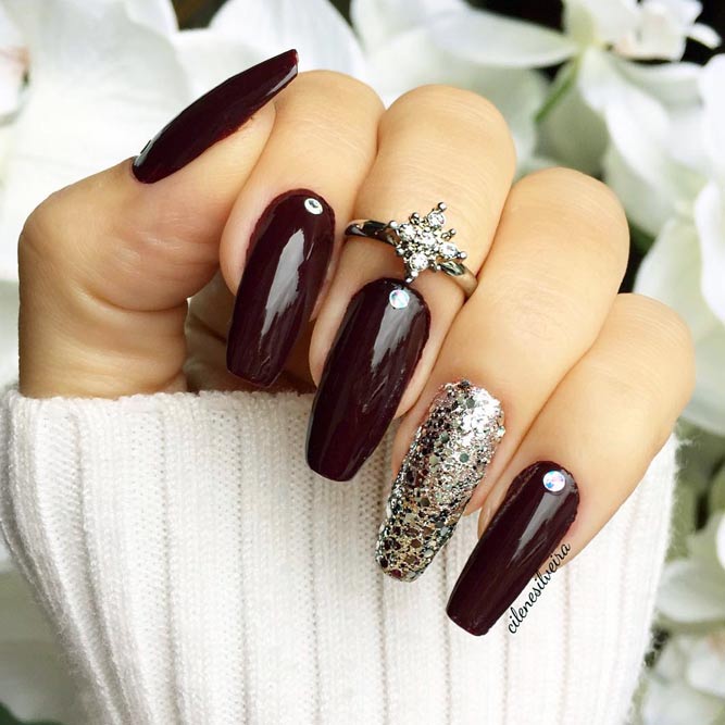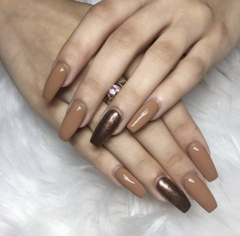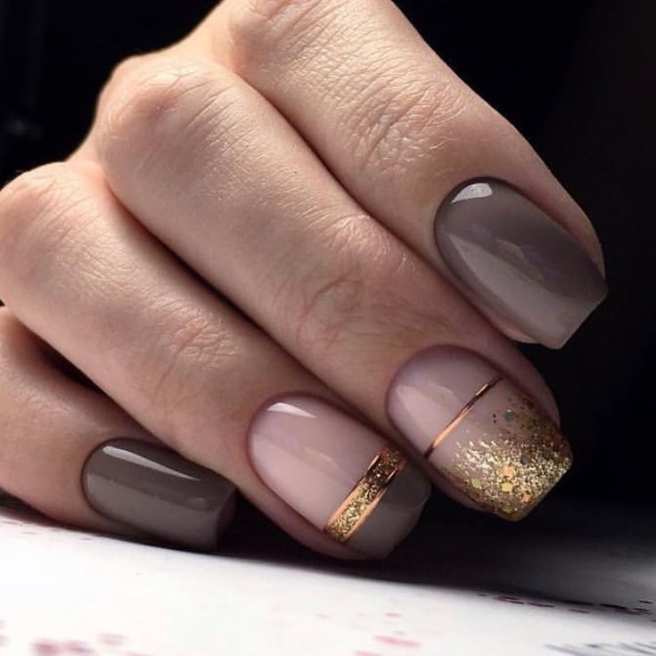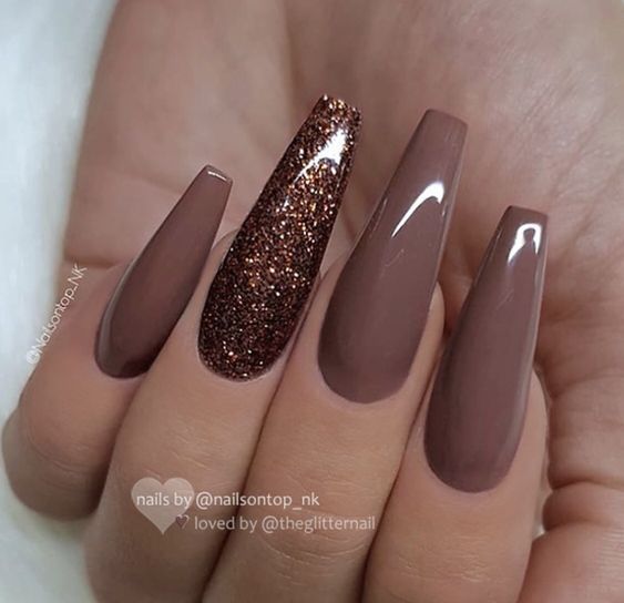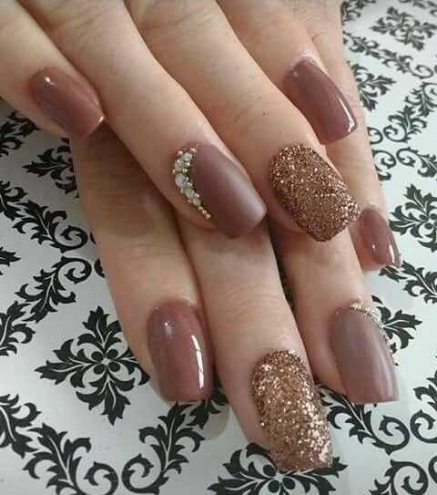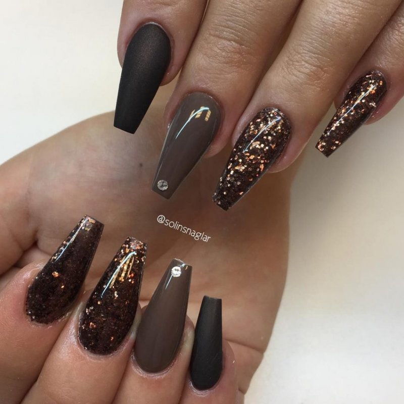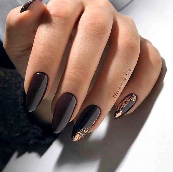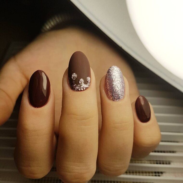 Стразы, блестка или фольга — отличное дополнение для любых оттенков коричневого. Такой маникюр удивит как ваших старых друзей, так и новых знакомых — пользуйтесь этим преимуществом.