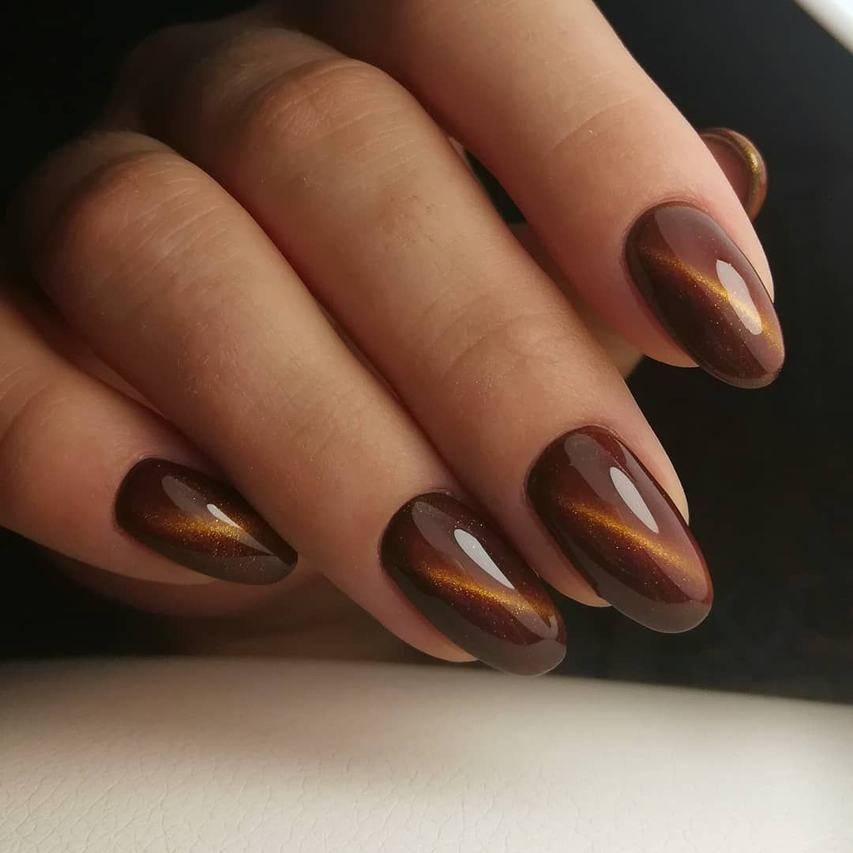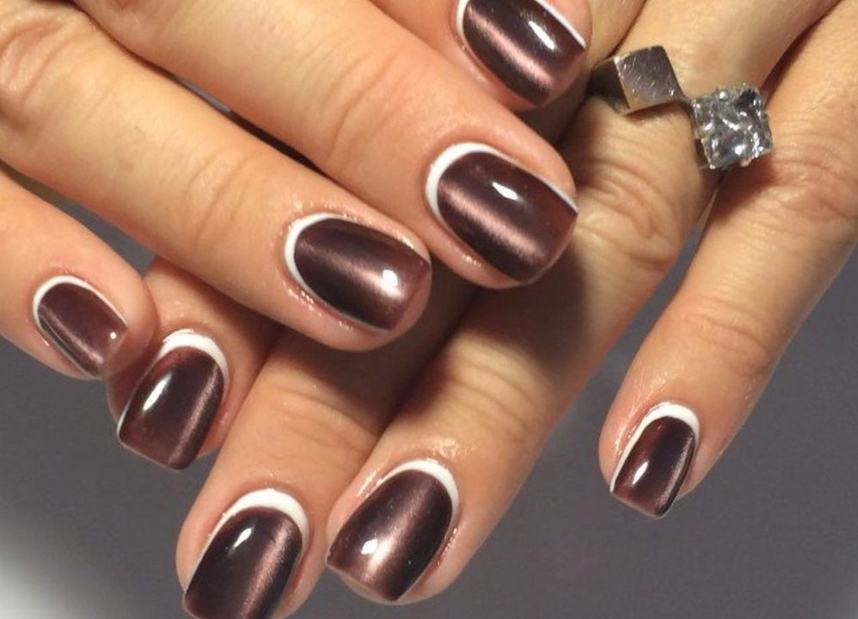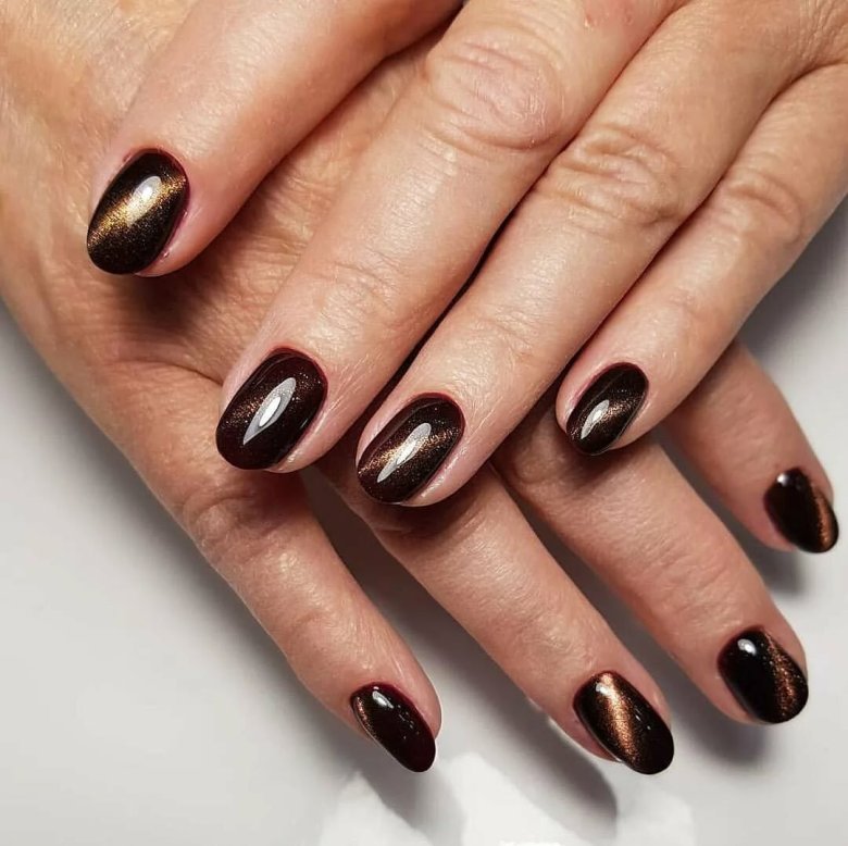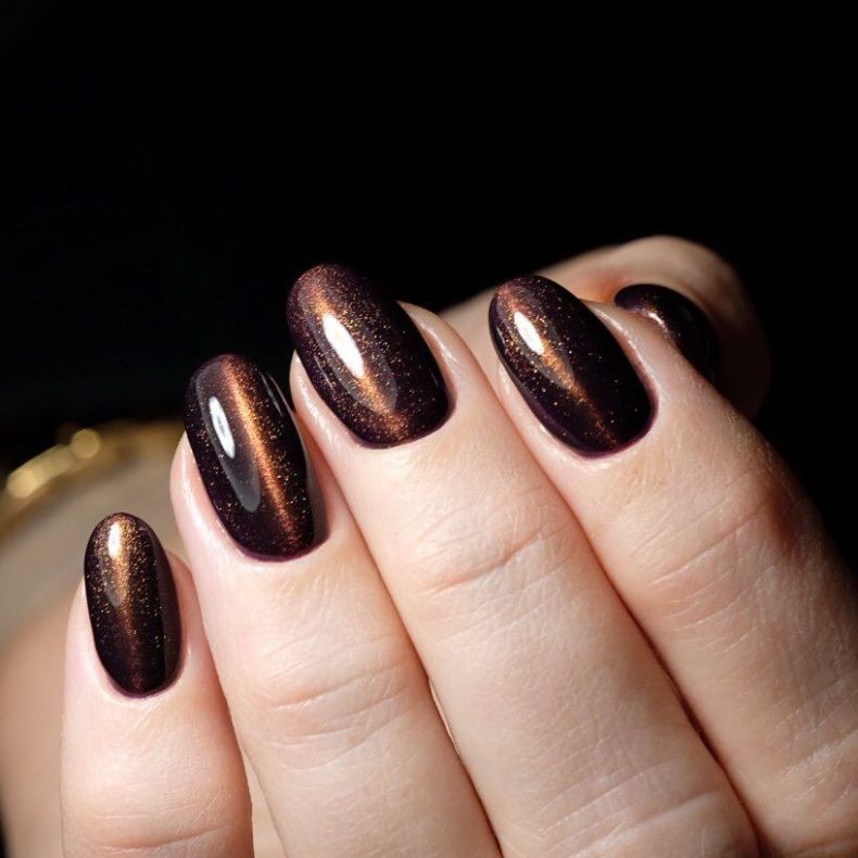 Мягкие переливы в шоколадных тонах позволит создать покрытие с эффектом «кошачий глаз». При выборе магнитного варианта модницы получают еще и оригинальный дизайн.