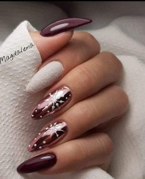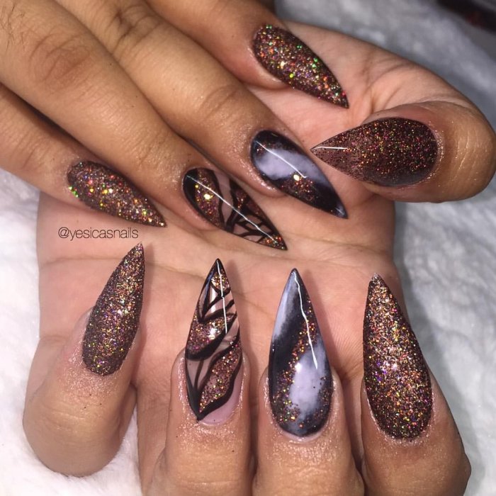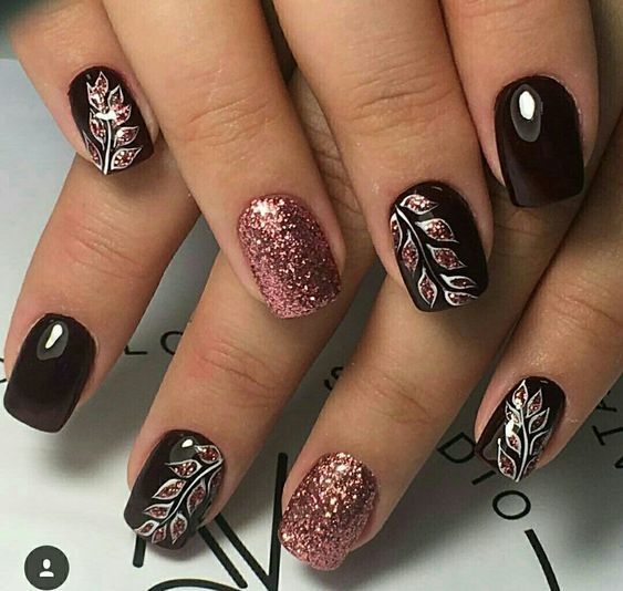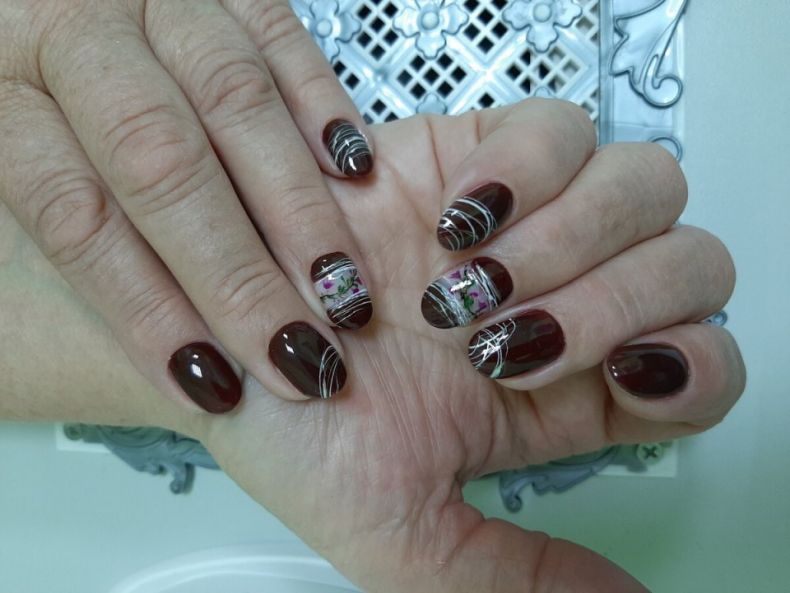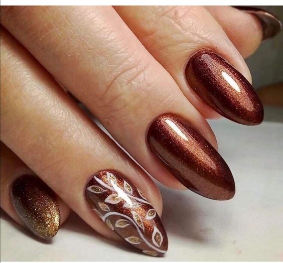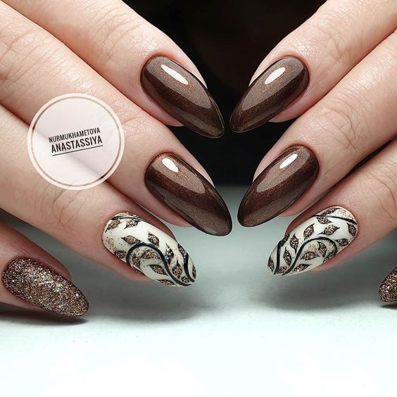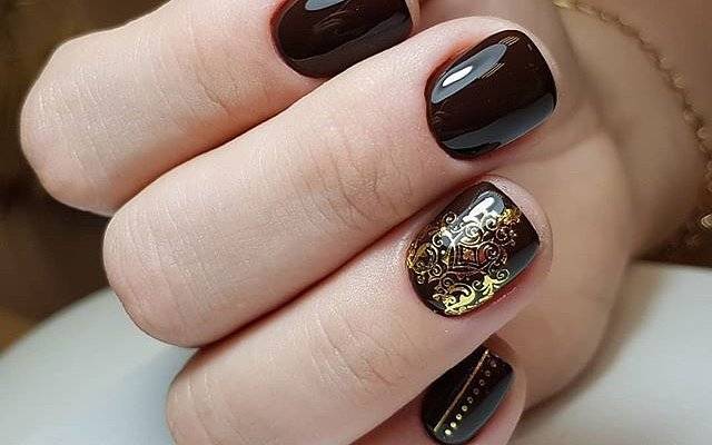 Это одна из самых красивых разновидностей нейл-арта. Коричневый колер выглядит насыщенно. Такой маникюр отлично впишется в праздничный образ.
