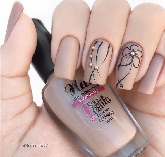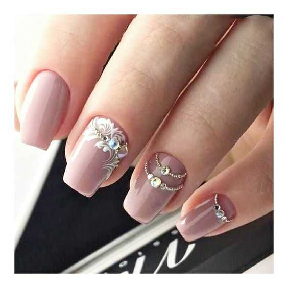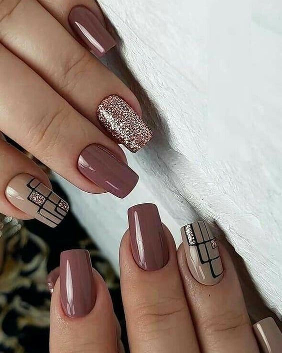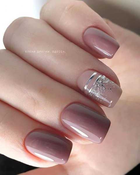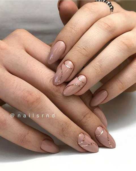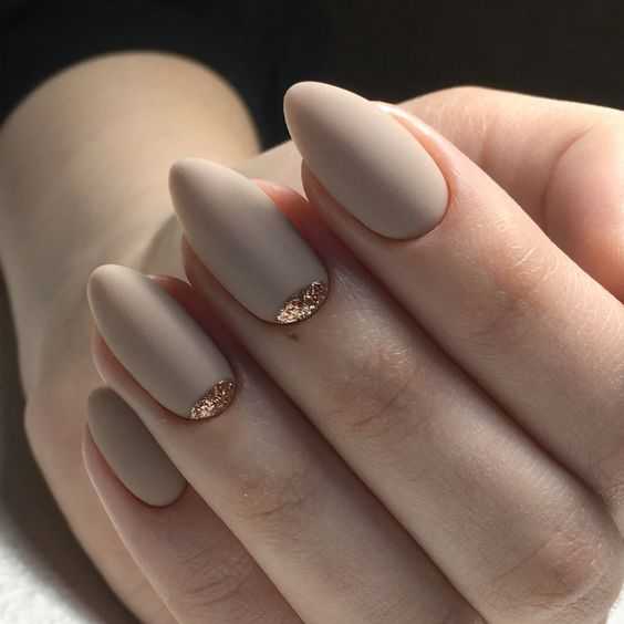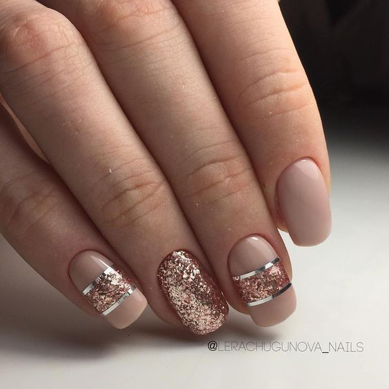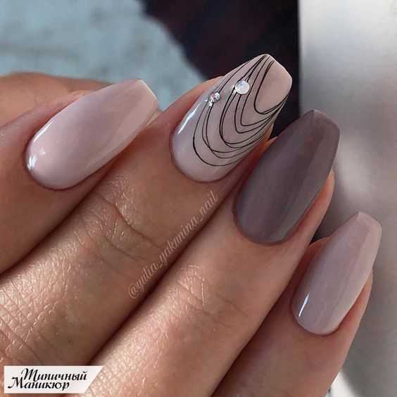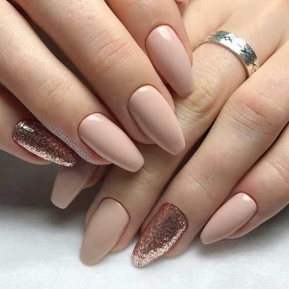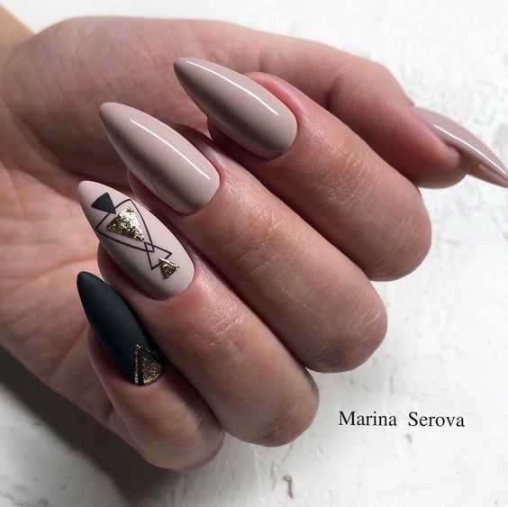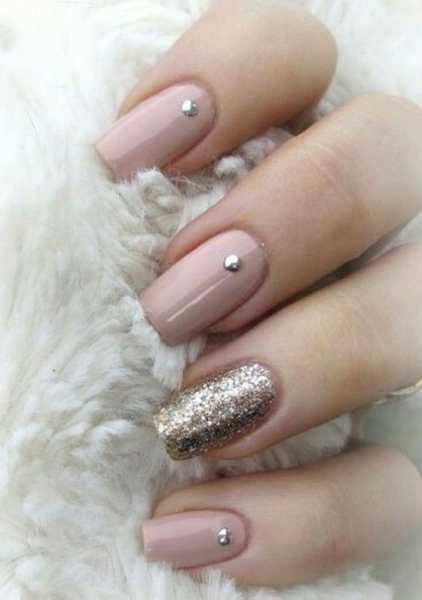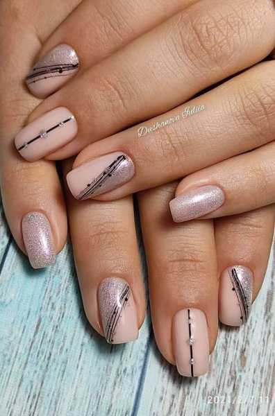 Для тех, у кого короткие или квадратные ногти, хорошим выбором будет бежевый цвет. По желанию украсьте геометрическим узором или небольшим количеством блесток.