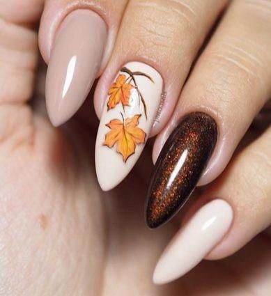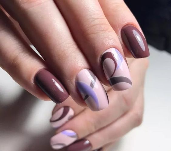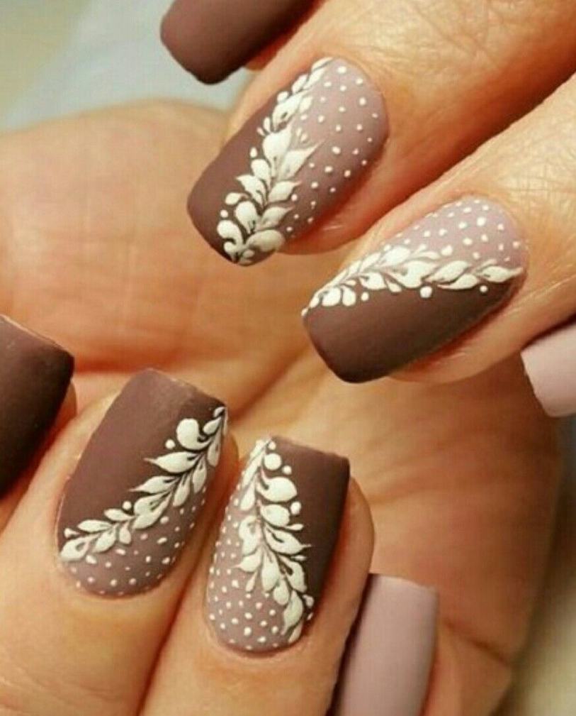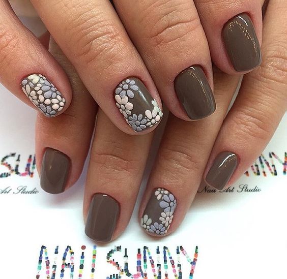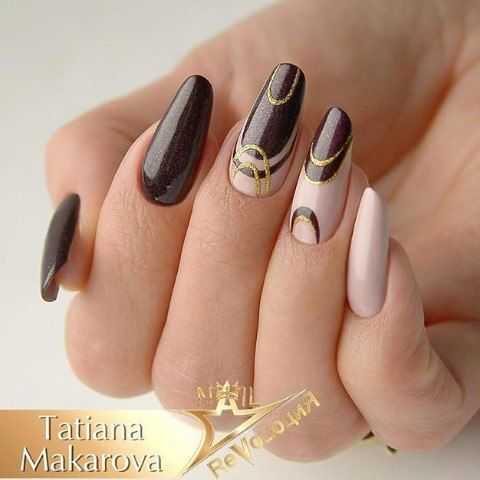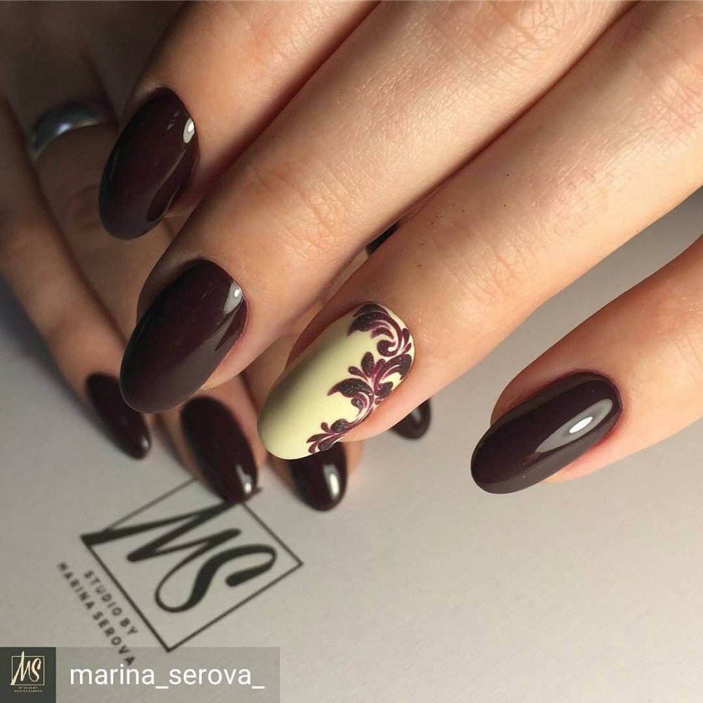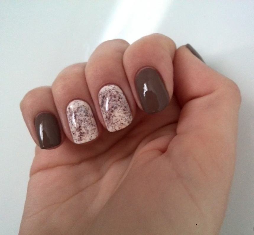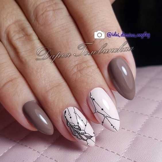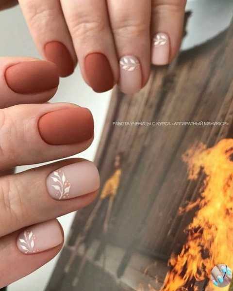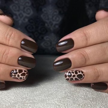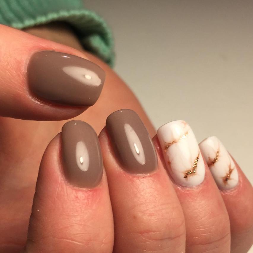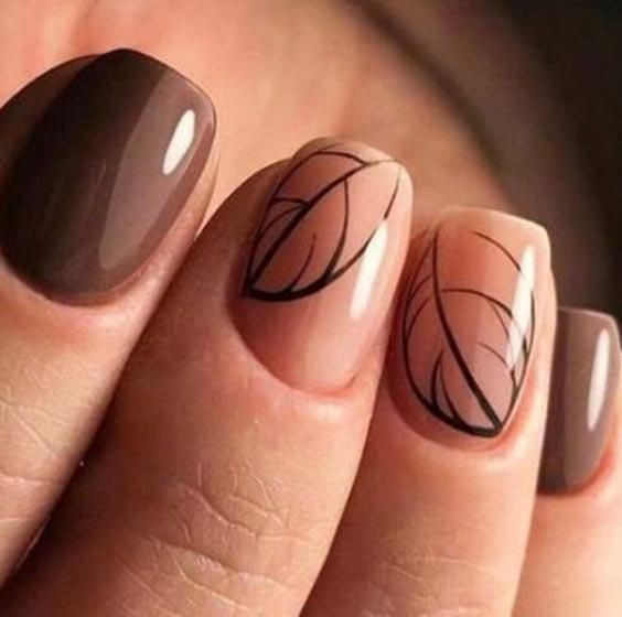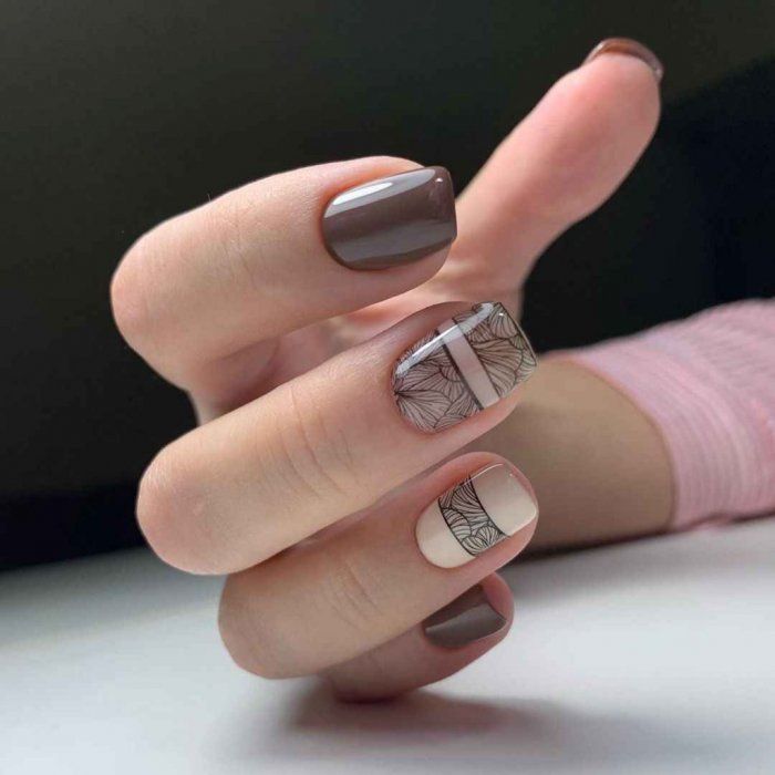 Самым беспроигрышным вариантом является сочетание коричневого и бежевого цветов. Бежевым цветом как правило покрывают несколько ноготков, на которых прорисовываются рисунки коричневым цветом.