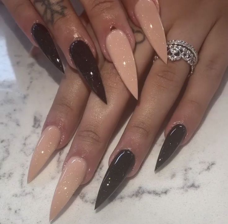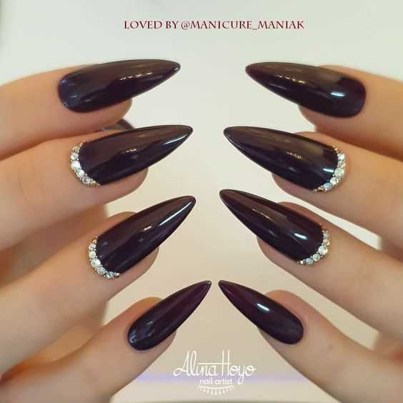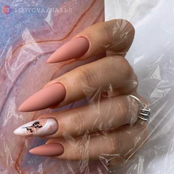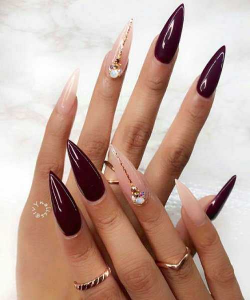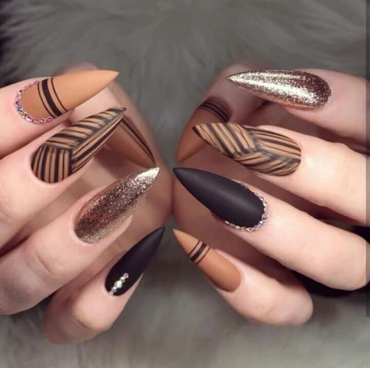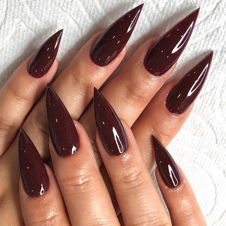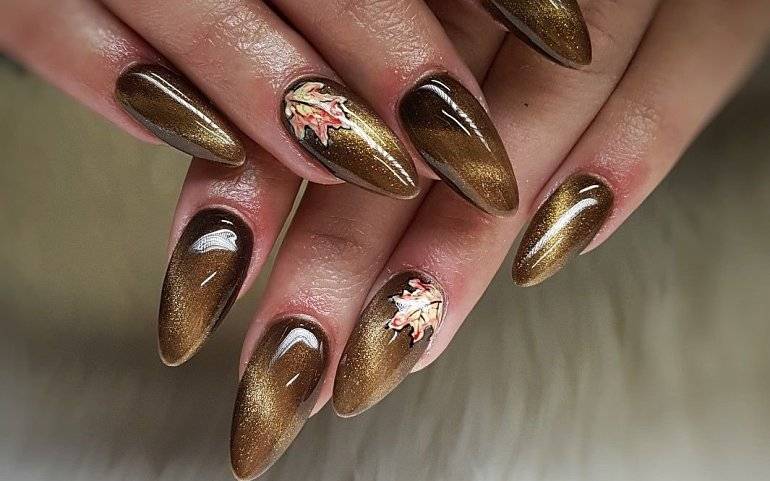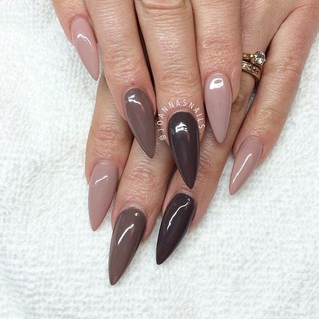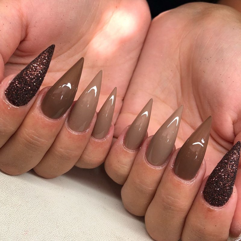 Дизайн в коричневых тонах для острых ноготков всегда в моде, его часто предлагают для выполнения стилисты и мастера нейл-арта. Такой насыщенный и сочный цвет сам по себе будет украшением эпатажных ноготков, которым даже не потребуется других акцентов и «изюминок».