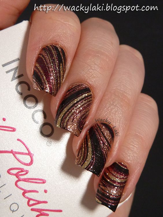 Эта техника исполнения маникюра в шоколадных тонах смотрится особенно эффектно. Для создания характерных мраморных разводов задействуют черный и белый цвета.