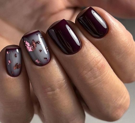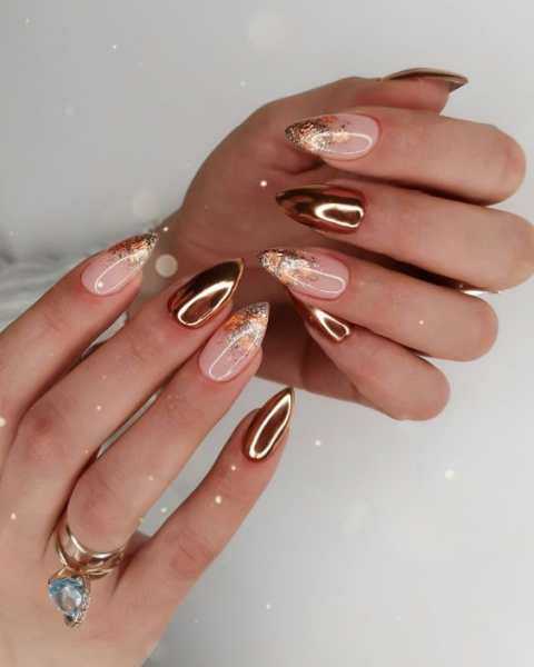Если вы предпочитаете медный оттенок, обязательно используйте глянцевый лак. Цвет может быть однотонным или дополненным мелкими блестками или пудрой.
