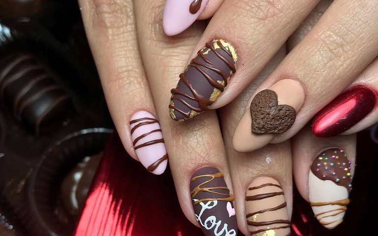 Еще одна тенденция подразумевает развитие «сладкой» кофейно-шоколадной темы в дизайне ногтей. На светло-коричневых ногтях рисуют кружечки с кофе, повторяют фактуру шоколада, изображают объемные зерна кофе и какао. Это все великолепие можно комбинировать с матовым пудровым дизайном или вязаным рисунком.