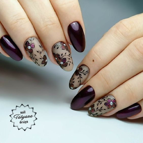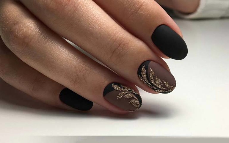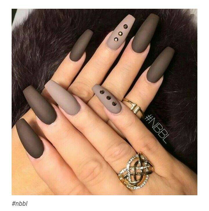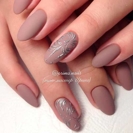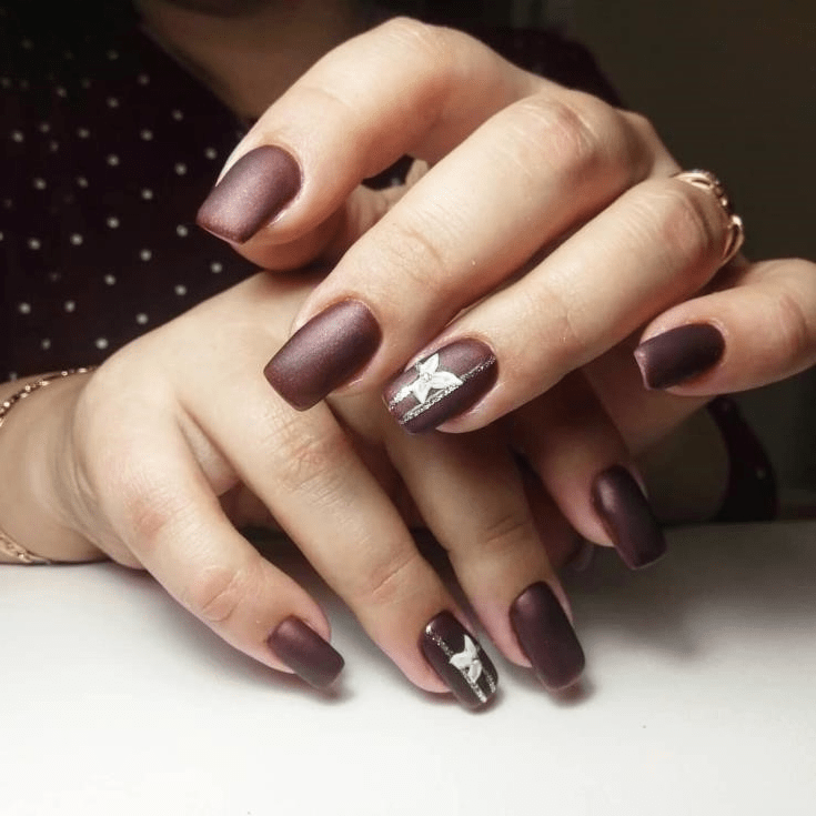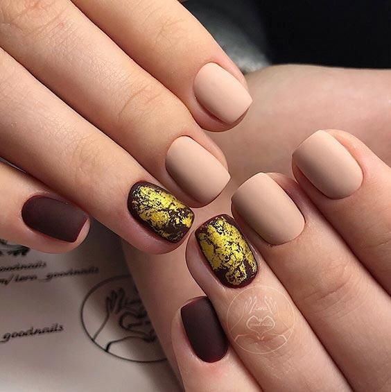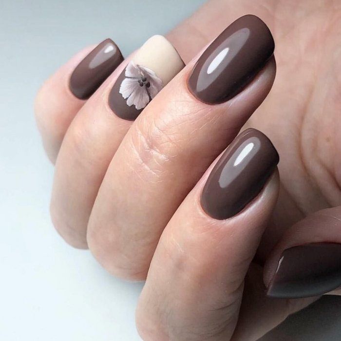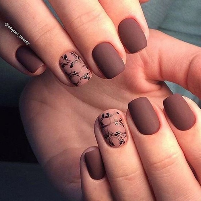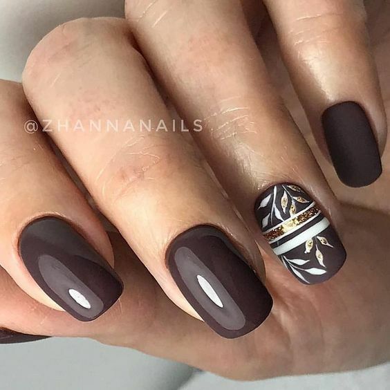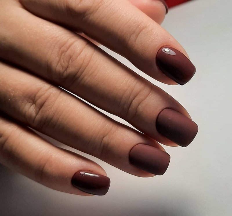 Матовый маникюр коричневого цвета встречается не слишком часто. А для его создания рекомендуется использовать темные оттенки — кофейный, шоколадные и так далее.