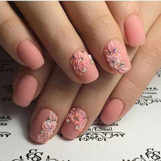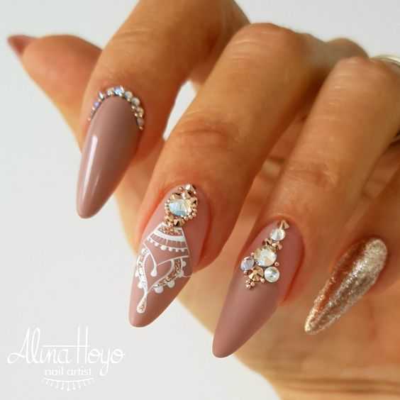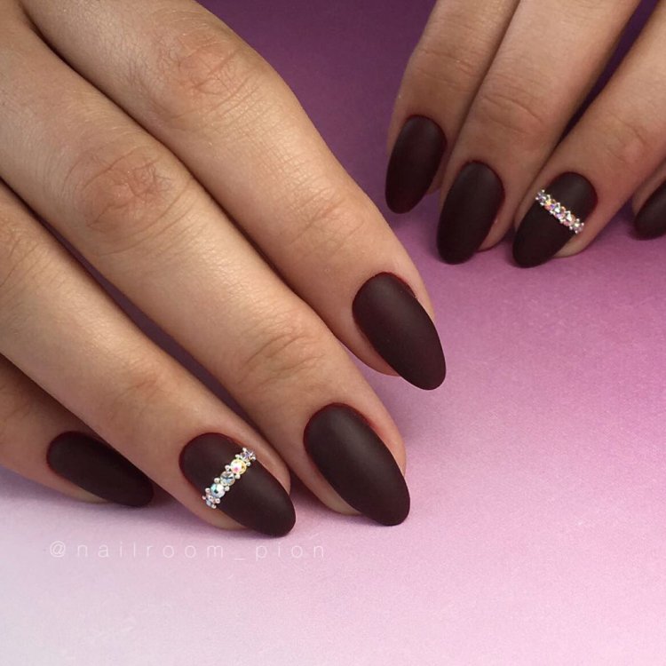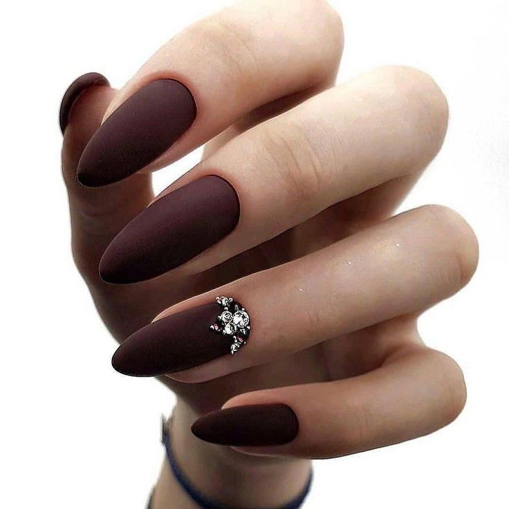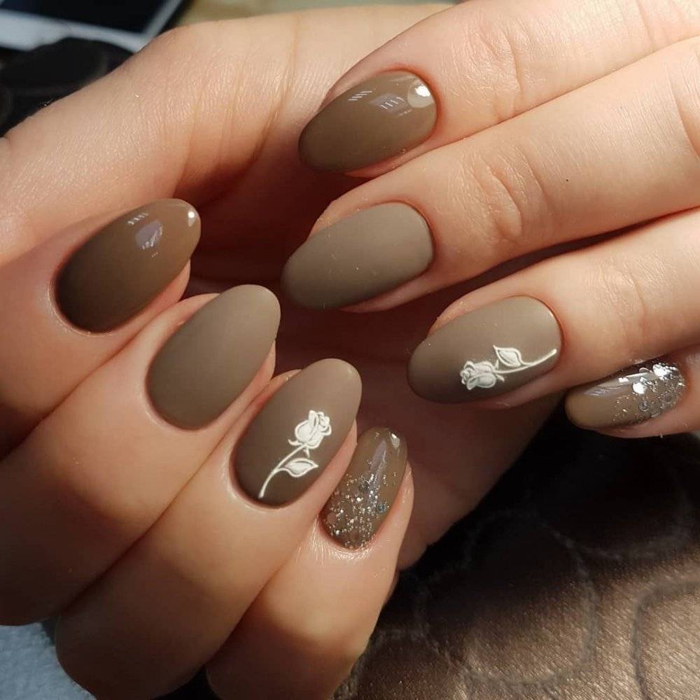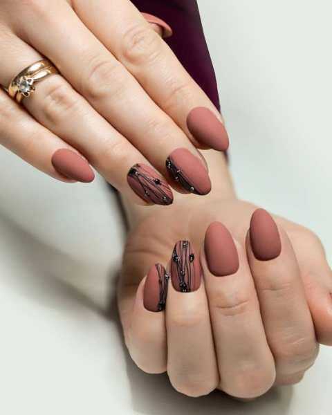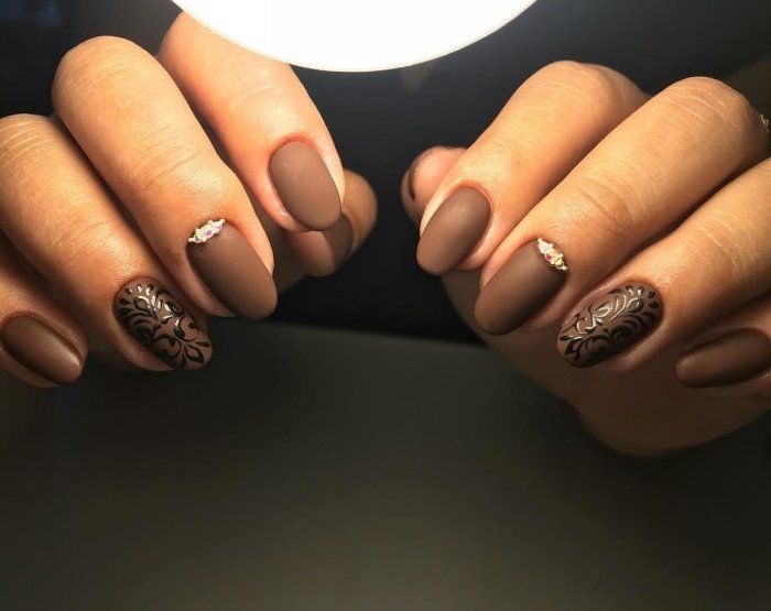 Матовый лак коричневого цвета сделает нейл-арт нежным и женственным. Привлекательнее всего смотрятся светлые оттенки коричневого. Матовое покрытие отлично гармонирует с декором в виде страз.