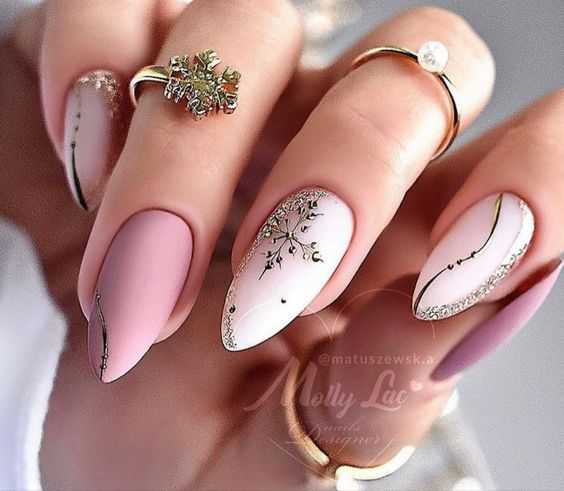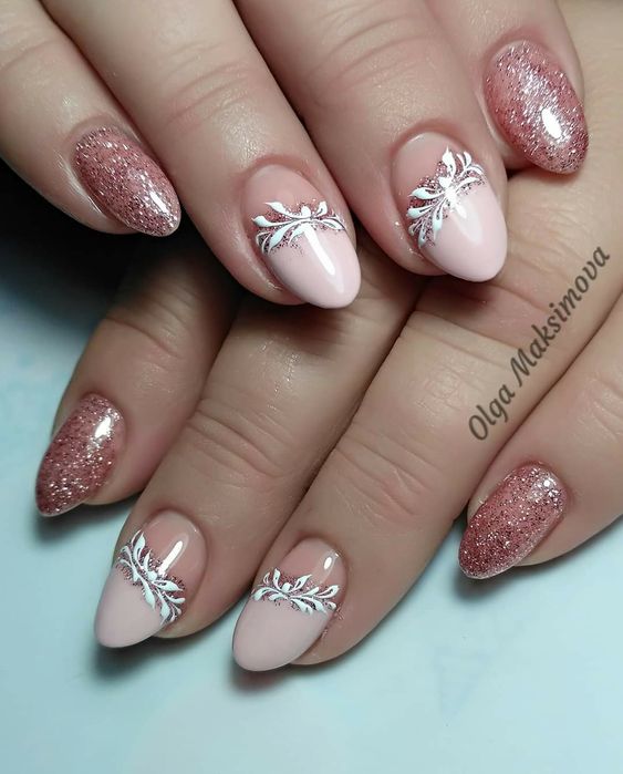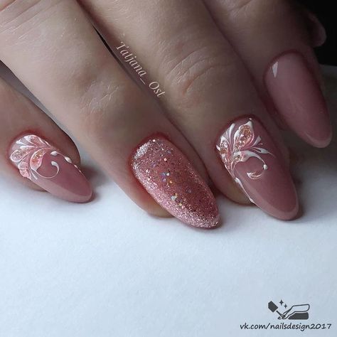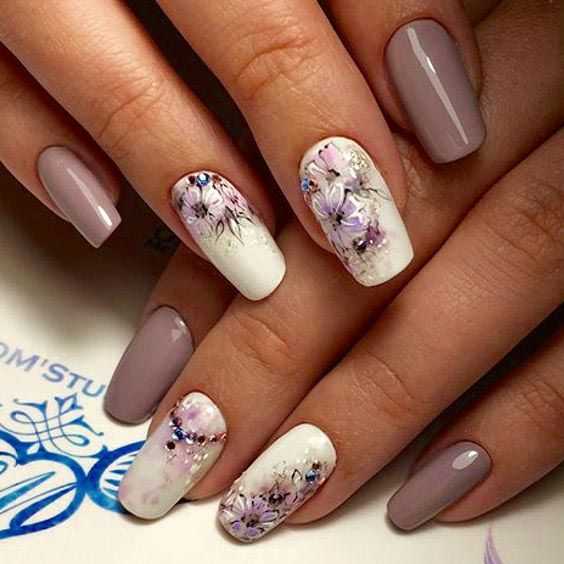 Нежные, светлые тона этой цветовой палитры выглядят стильно, годятся для любой формы ноготков. Украшать их лучше скромно – белым или серебристым ажурным узором, мелкими рисуночками, жидким глиттером.