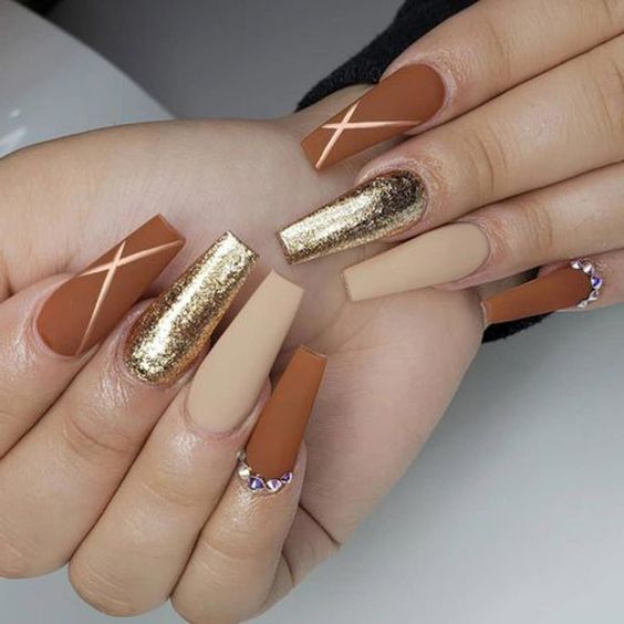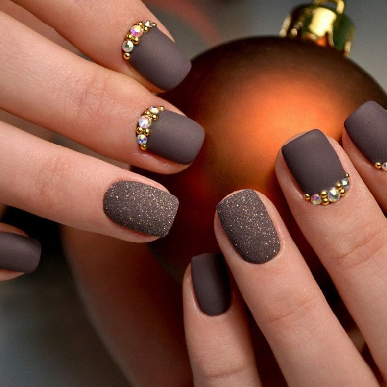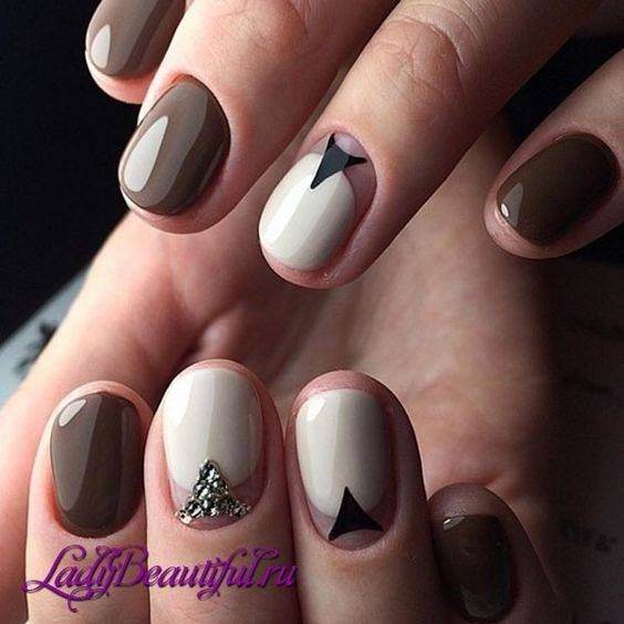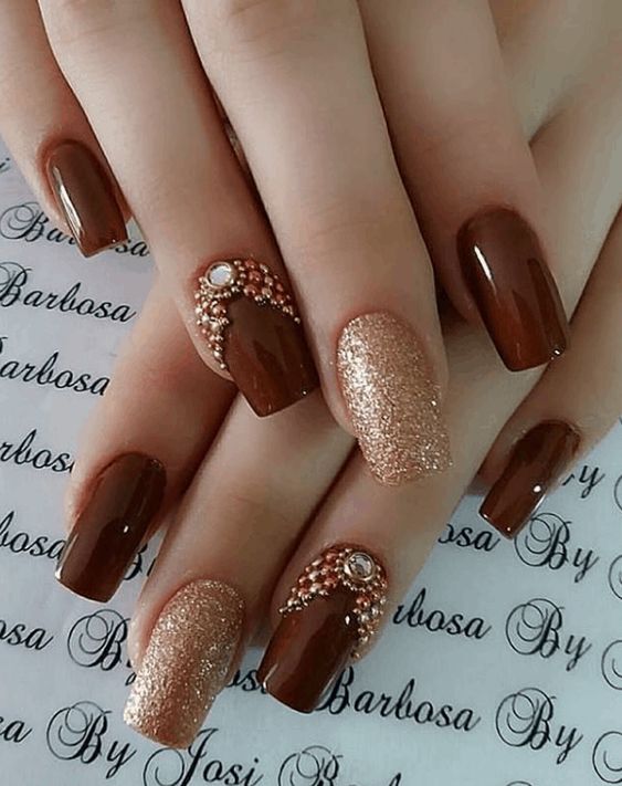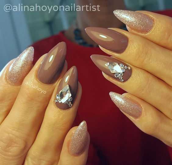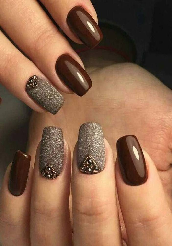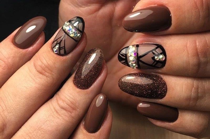 В коричневом маникюре можно задействовать золотистые и серебристые блестки, стразы размещают там, где требуется.
