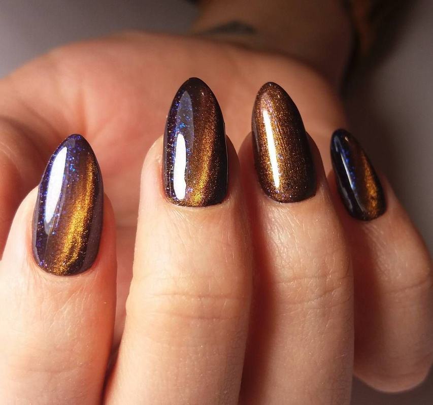 Также хорошее решение — применять гель-лак коричневый с необычной текстурой, например, рельефный, с магнитным эффектом.