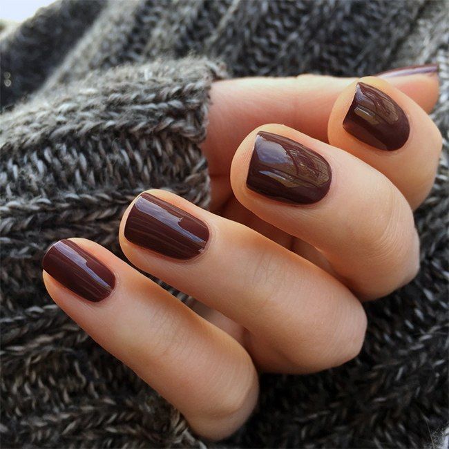 Коричневый лак отлично подходит для осеннего маникюра. Осенью это второй по популярности цвет после желтого. Это спокойный, не крикливый цвет. В природе это цвет земли и опавших листьев. В культуре многих народов мира коричневый символизирует плодородие. В обычной жизни коричневый представлен оттенками кофе или плитками шоколада. В дизайне ногтей коричневый хорошо сочетается, золотыми, желтыми и черными цветами.