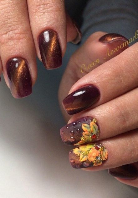 Это приятный благородный цвет, который дарит тепло, уют, заряд положительной энергии. С ним можно создать много интересных вариантов маникюра, на разные случаи.