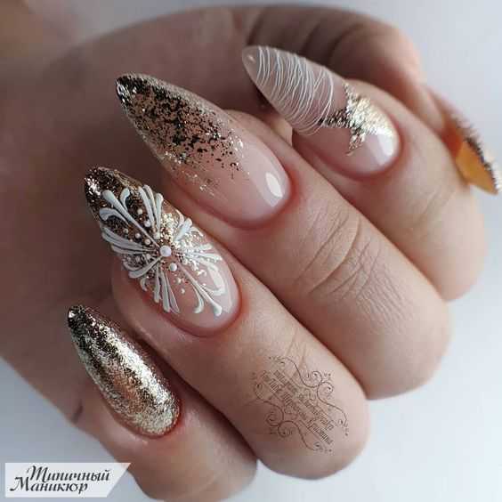 Идеальное решение для праздника – использовать блёстки на ногтях, переливающиеся покрытия, эффектные украшения и стразы.