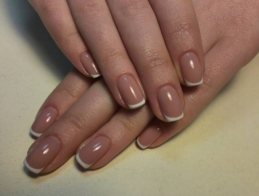 Для скромного повседневного дизайна можно делать лаконичный коричневый френч, лунный маникюр.