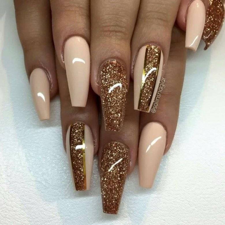 Наиболее дорогая и праздничная композиция сочетания коричневого цвета – это сочетание коричневого с золотом. Для декора вечернего маникюра мастера нейл-арта используют золотую фольгу, глиттер, конфетти, полноценное покрытие, создающее вид металлического глянца.
