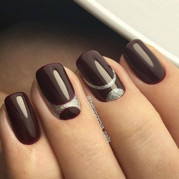 Для вечернего образа подойдут сдержанные строгие оттенки коричневого — например, кофейный. Ногти можно декорировать геометрическими узорами или серебристыми блестками.