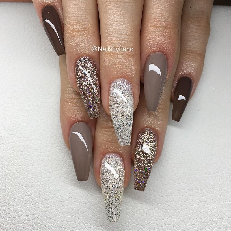 Множество дам стремится к блеску и сиянию, создать его помогут блестки. Коричневый колер хорошо с ними гармонирует.