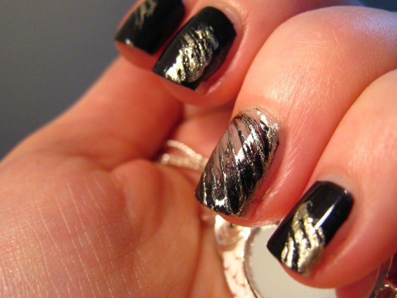 Можно также использовать камни, фольгу, фольгированные ленты. Из блесток предпочтение отдают глиттеру. Мерцающий эффект создает жидкая фольга.