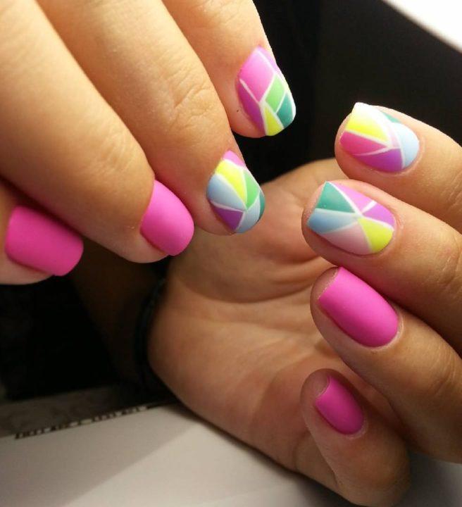 Также на ногтях могут быть изображены искаженные геометрические фигуры или разноцветные линии, беспорядочно «разбросанные» по ногтевой поверхности с использованием матового лака и глиттера.