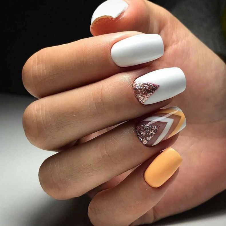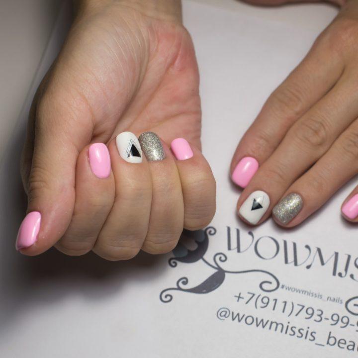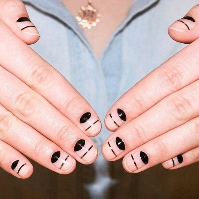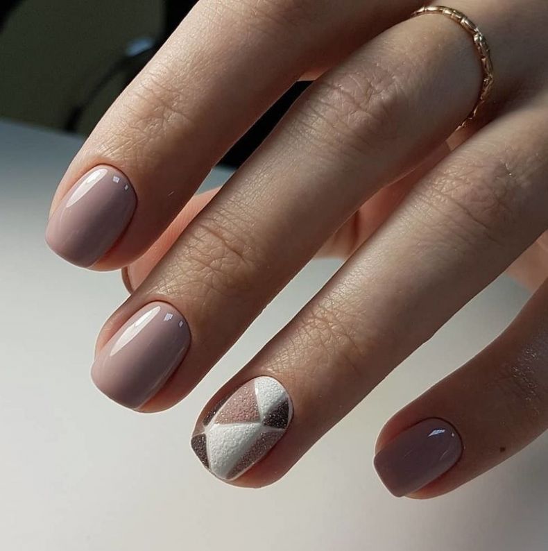 - Если выбрать геометрический дизайн, а фигуры и рисунки выполнить нейтральным цветом или блестками, то дизайн станет личным, совершенно новым нейл-артом.