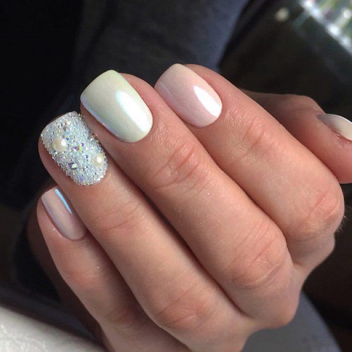 Маникюр на свадьбу принято выполнять на короткие ногти в тон цвета платья невесты. Почти всегда он в светлых тонах и с добавлением блесток, перламутра, втирки, светоотражающих элементов, которые придают дополнительное сияние. Светлые, пастельные тона – основа свадебного образа. Добавление страз придаст дополнительный свет и роскошь.