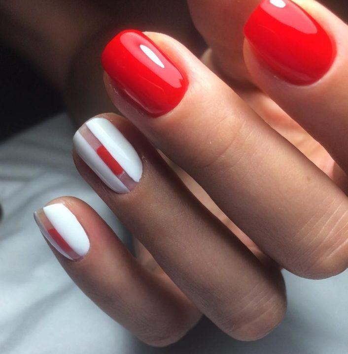 В моде, как уже было перечислено, абстрактные рисунки, геометрические фигуры, а также волны. Причем актуальны крупные формы. Также в нынешнем году популярна шотландская клетка на ногтях в красном, зеленом или бежевом исполнении.