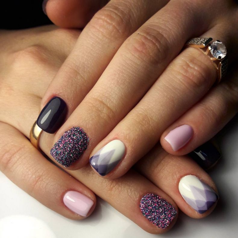 В модном ногтевом дизайна остались стразы небольшого размера, цветной песок, блёстки различных оттенков, от классического серебристого до ультра яркого.