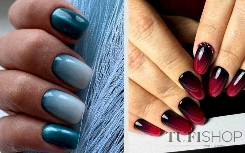 Омбре. Техника омбре позволяет создать плавный переход от одного цвета к другому. Вы можете использовать различные оттенки одного цвета или создать контрастные сочетания. Омбре маникюр легко самостоятельно выполнить при помощи специальных губок или специальных кистей.