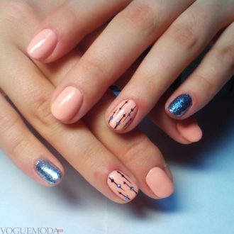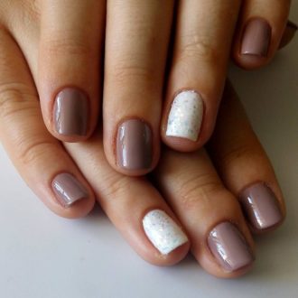 Дизайнеры маникюра советуют все же поддаться модным тенденциям и разбавить монохромность маникюра выделением одного-двух ноготков фактурным лаком или другим оттенком. К примеру, накрасить все ногти глянцевым лаком бежевого цвета, а безымянный выделить фактурным, но на тон светлее. Еще одним интересным вариантом может стать сочетание светло-абрикосового оттенка и цвета какао, которые отлично гармонируют друг с другом по законам колористики.